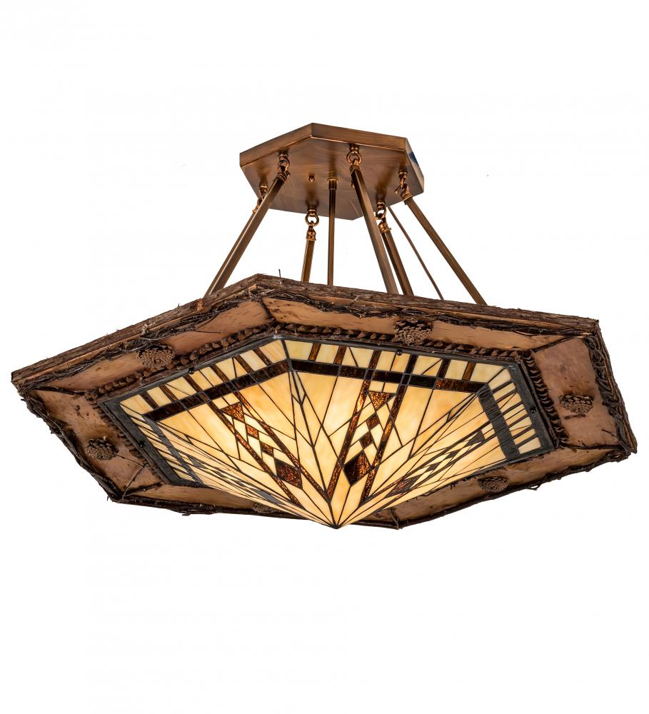 Enchanting southwestern styling and an intriguing Native American design reveal the magic and mystery of tribal symbols in stunning art glass and matching hardware. The hexagonal lighting fixture features a Sand Beige and Bark Brown granite glass shade which is framed by an all natural wooden medallion. The hardware is finished with a warm Cinnamon Coffee metallic powder coat. Handcrafted by highly skilled artisans in our 180;000 square foot manufacturing facility in Upstate NY. Custom styles; colors; and sizes available; as well as dimmable energy efficient lamping options. The 39.5-inch wide fixture is UL and cUL listed for dry and damp locations.