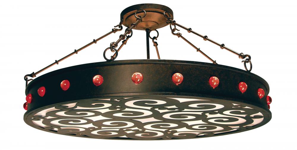 Jules is a Ceiling Light that offers a unique scrolled design where forms and accents illuminate brilliantly and are complemented with Ruby Red colored jewels around the perimeter. Embraced by the round steel frame in a Cajun Spice finish fits a Statuario Idalight diffuser for a soft; yet vibrant illumination. This fixture is intended for mounting in either singular or multiple clusters across ceilings. Handcrafted by highly skilled artisans in our manufacturing facility in Upstate New York; this transitional styled fixture is available in a wide range of custom choices including various designs; colors; sizes and dimmable energy efficient lamping options such as LED. The fixture is UL and cUL listed for damp and dry locations.