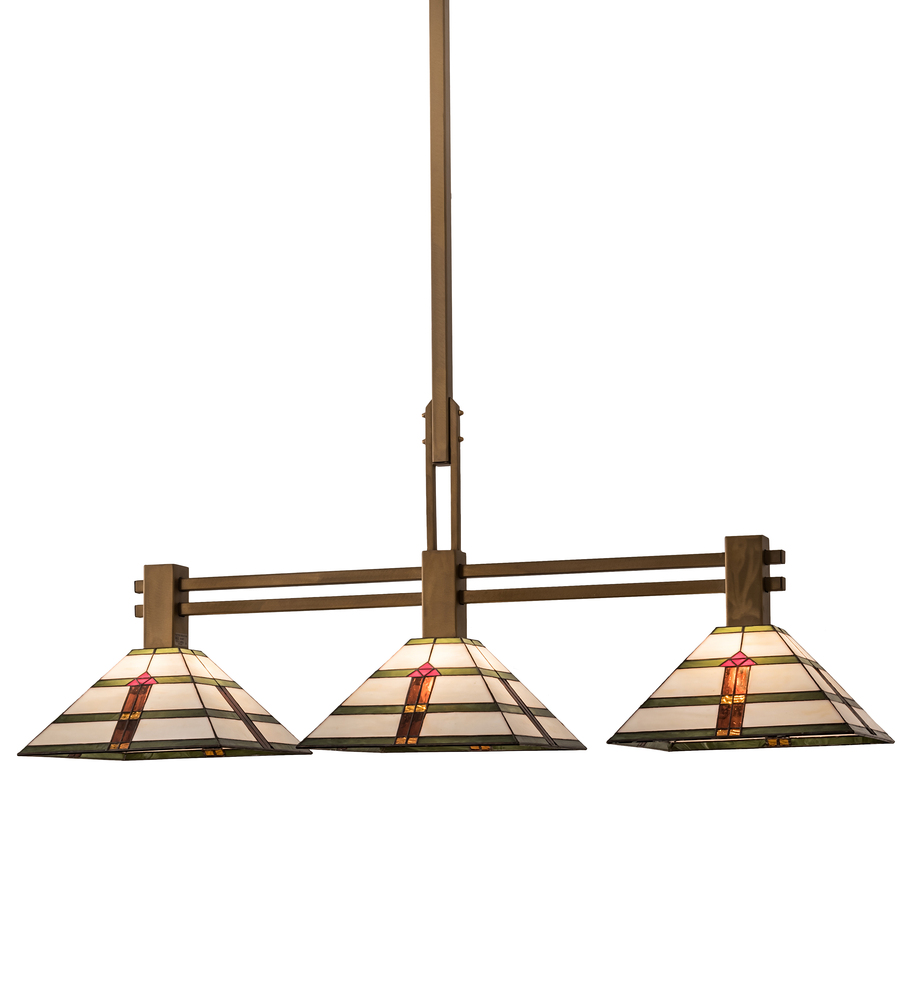 Clean geometric lines; structural details and meticulous attention to quality are hallmarks of the stunning pendant. 3 appealing Mission styled art glass shades feature Kale Green horizontal lines on a Beige background highlighted by Flame Opalescent Glass with Wispy Rootbeer arrowhead motifs. The shades are created using the famous Meyda Tiffany copper foil construction process while the decorative frame and hardware are finished in Matte Buttered Brass finish. The perfect pendant to illuminate islands; billiard tables; bars; counters and tables. Custom sizes; styles; colors and dimmable energy efficient lamping options such as LED are available. The 4 foot long fixture is UL and cUL listed for damp and dry listings.
