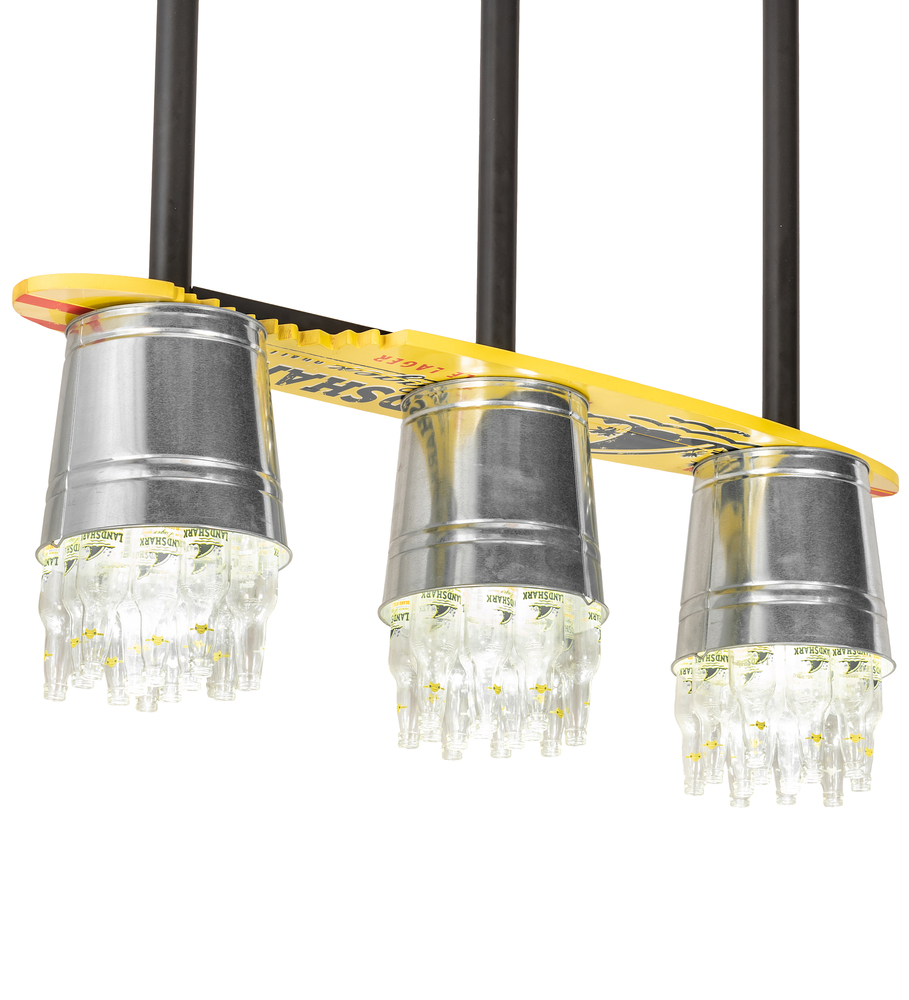 Surf's Up; so let's party. A cool LandShark Surfboard provides the wooden platform for three inverted buckets of LandShark beer bottles. Each Beer Bucket includes 13 clear glass beer bottles. The hardware is featured in a Solar Black finish. The oblong pendant is ideal for illuminating a tiki party; bar; island; counter or table. Custom crafted by highly skilled artisans in our 180;000 square foot manufacturing facility in Yorkville; New York. UL and cUL listed for dry and damp locations. Contact us for your personalized custom lighting solutions.