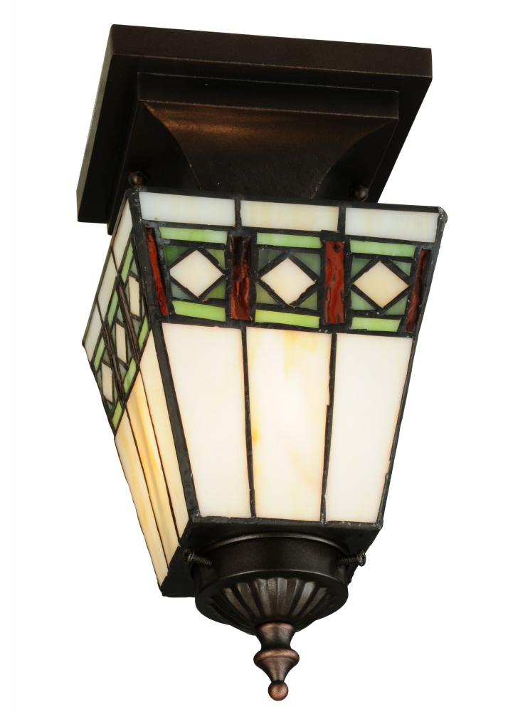 Simple clean lines and geometric shapes are the hallmarks of the Mission style. This sleek Bisque Beige stained glass shade features a simple; elegant diamond pattern in Beige accented with Amber; Jade and Peridot borders. The hardware and decorative accents are featured in a Mahogany Bronze finish. The art glass shade is handcrafted using the famous Meyda Tiffany copperfoil construction process. Contact Meyda for custom designs; colors; finishes; sizes and dimmable energy efficient lamping such as LED. The ceiling fixture is UL and cUL listed for damp and dry locations.