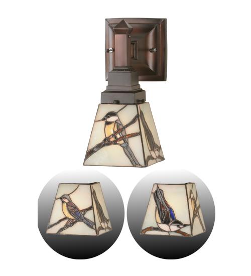 Bark Brown branches across a Azure sky make a pleasant repose for these often seen backyard bird early morning visitors on this art glass shade. A Meyda original design; handcrafted utilizing the copperfoil construction process using authentic art glass; the shade is complemented with hardware in a Mahogany Bronze. Dimmable energy-efficient lamping options; as well as custom sizes; styles and colors; are available. The sconce is UL and cUL listed for damp and dry locations.