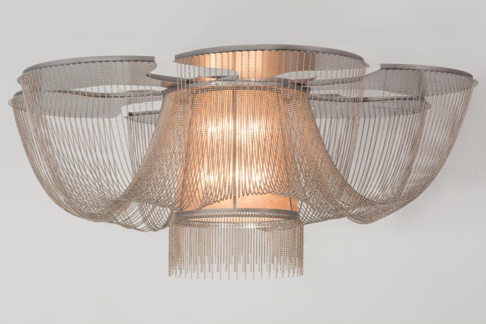 Like the gentle flow of a water fountain with tiny droplets dancing in mid-air; you can almost hear the pitter-patter as it creates soft ripples in the imaginary pool below. Beautiful ambient light evokes from a tapered Silver Mica shade which is complemented with a Statuario Idalight bottom diffuser and Nickel finished hardware. Handcrafted in the USA; this flushmount is available in custom designs; sizes and finishes; as well as dimmable energy efficient lamping options. The fixture is UL and cUL listed for damp and dry locations.