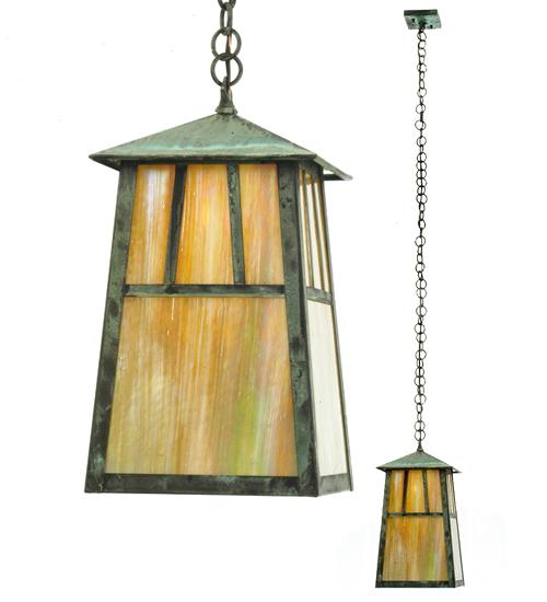 The Double Bar Mission has a pair Arts and Crafts style crossed bars that accent this handsome American Craftsman lantern style pendant. The fixture; handcrafted in the USA by Meyda artisans; is finished in Verdi and has Beige Iridescent glass panels.