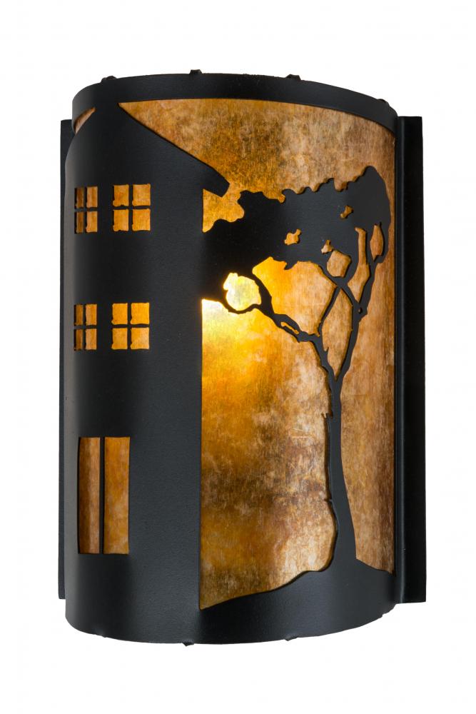 This delightful Country Fair sconce features a storybook image of Americana. A 2-story American Home with a towering tree eclipsing the sun makes for a beautiful Amber Mica wall lighting design. This unique wall luminaire is enhanced with a frame; decorative accents and hardware featured in a Textured Black finish and handcrafted in Yorkville; New York. Custom options include special sizes; finishes and colors; as well as dimmable energy efficient lamping such as LED. The fixture is UL and cUL listed for damp and dry locations.