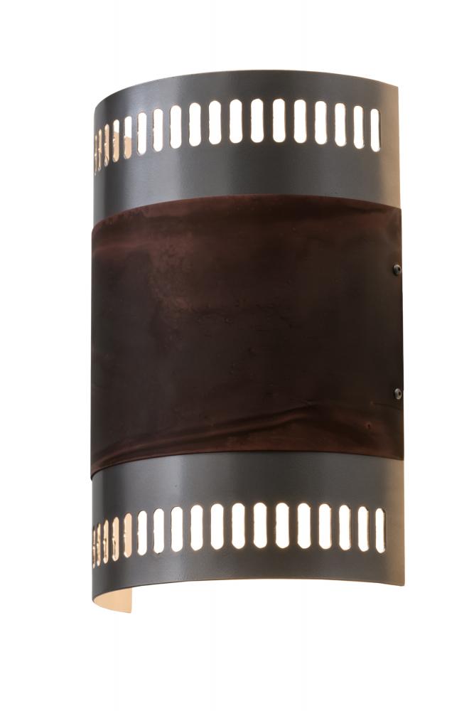 Inspired by distinctive grooved patterns used in European architecture; this impressive sconce features Nickel finished steel channels on the top and bottom. The channels border a stunning band of authentic Solid Copper with a charred finish. This extraordinary wall luminaire design is ideal for hallways and other areas throughout residential and commercial spaces. The fixture is handcrafted in the USA. Custom sizes; styles; colors and dimmable energy efficient lamps are available such as LED. This fixture is UL and cUL listed for damp and dry locations.