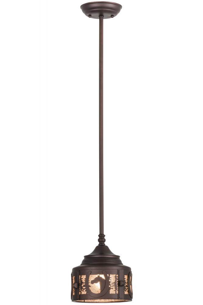 A horse portrait framed with a lucky horseshoe encircles this handsome fixture. Warm ambient light projects through stunning Silver Mica which is accented by Pine Tree silhouettes. Decorative hardware and accents are enhanced in a Mahogany Bronze finish. The pendant is handcrafted by Meyda artisans in the USA. Custom sizes; styles and colors are available. Energy efficient options are offered.