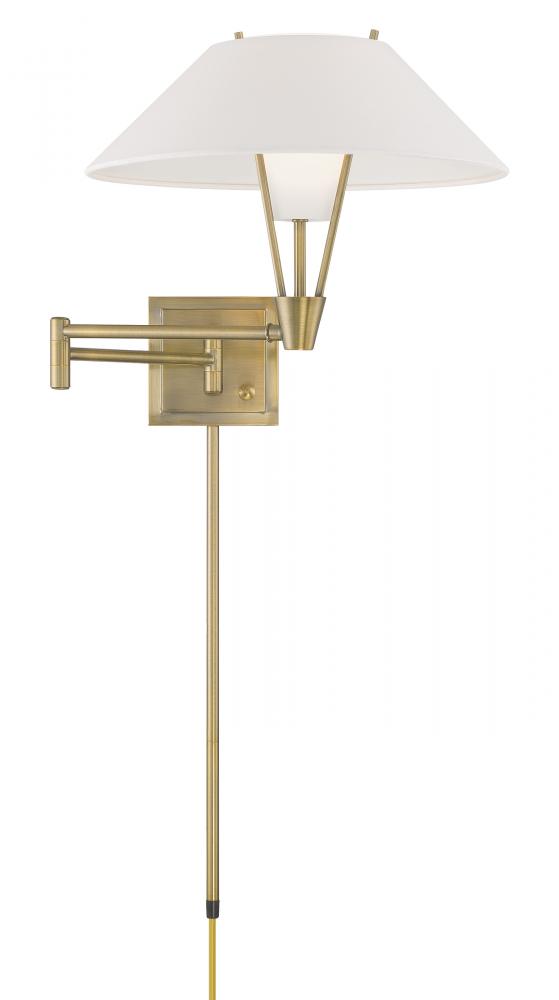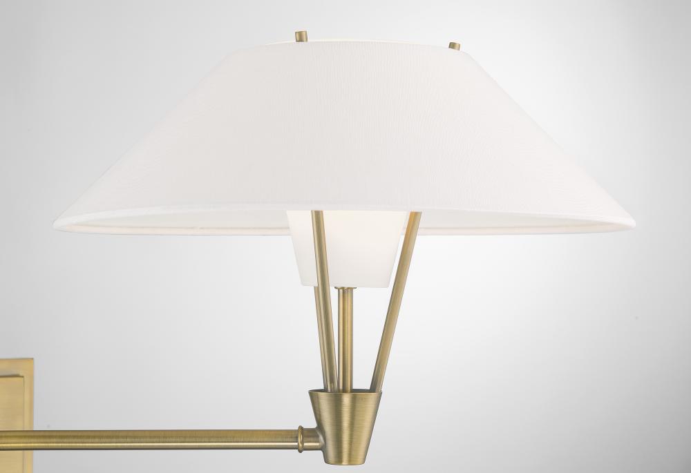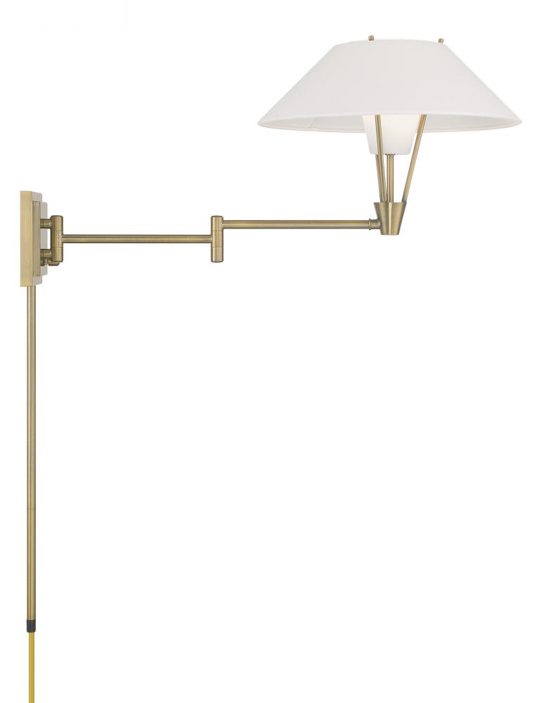 The Cody Swing Arm Wall Sconce has a refined, textured white fabric shade and a frosted glass diffuser giving a layered look to the fixture. Crafted of metal, the clean lines of the frame and backplate give this wall light a subtle air of contemporary elegance. Artful design and attention to detail are showcased through the shade's unique silhouette. Taking a modern approach, the flared shade adds visual interest while an inner frosted glass softly diffuses the light. Functional and decorative, the swing arm extends outward to 26 ¼” so you can focus the light where you need it most. This fixture's uplight design, adjustable length, and double shade make it the perfect lighting choice for reading, accenting art, or illuminating the bedside. Designed to meet your needs, the Cody Swing Arm Wall Sconce can be a hardwire or a plug-in fixture, with on/off switch on the backplate for ease of use. Capable of being dimmed, so you can set your illumination level to suit your space. Requires one 40-watt LED bulb, sold separately.
