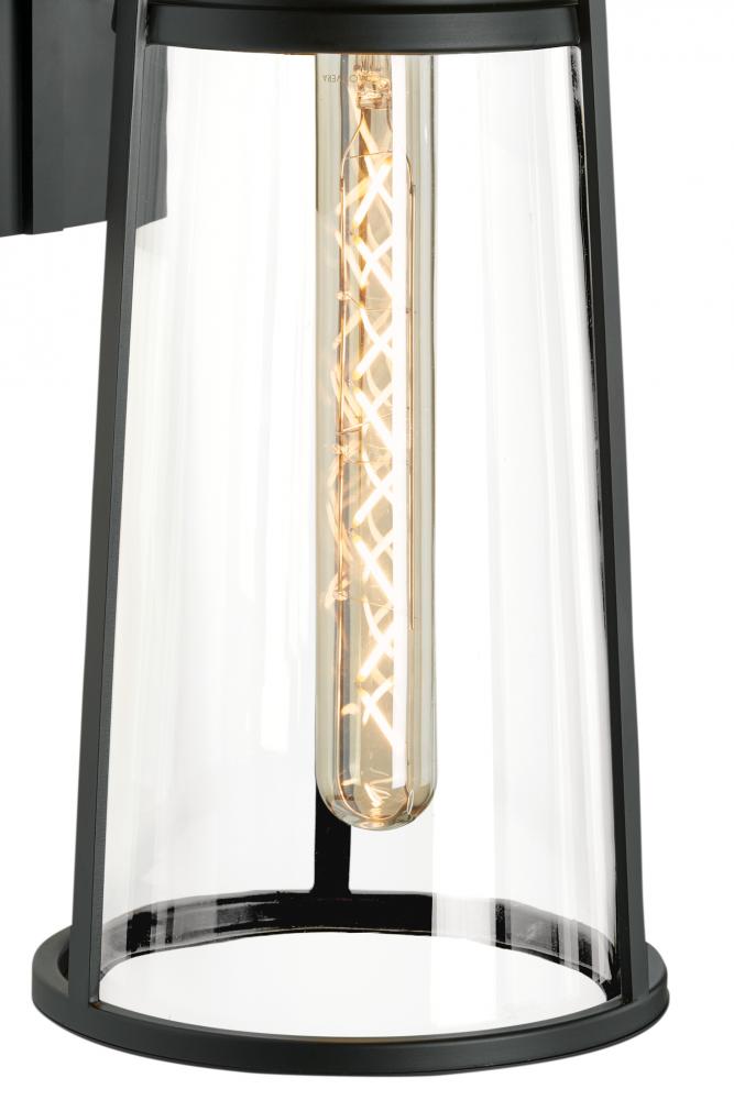 The voluptuous bell shaped fixture reinvents an iconic shape with its interplay of solid brass, clear glass and exposed bulb.