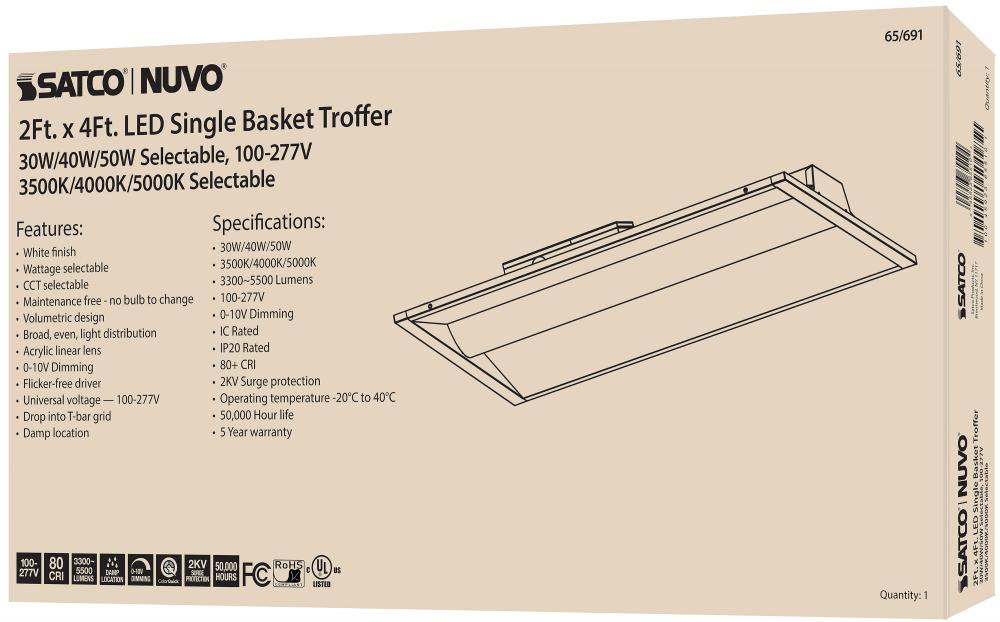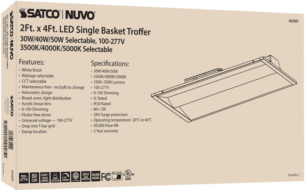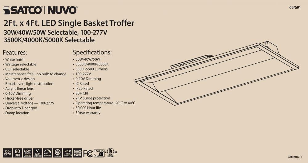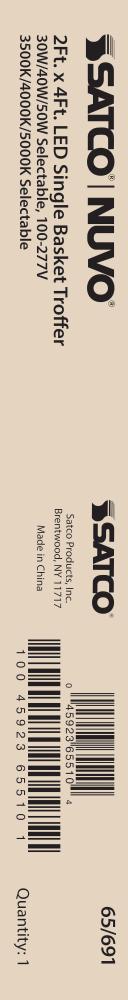 SATCO NUVO's 65-691 is a foot by four foot single basket troffer which features selectable wattage and color temperature. The troffer features an acrylic linear prismatic lens which allows for broad, even light distribution. The driver allows for flick