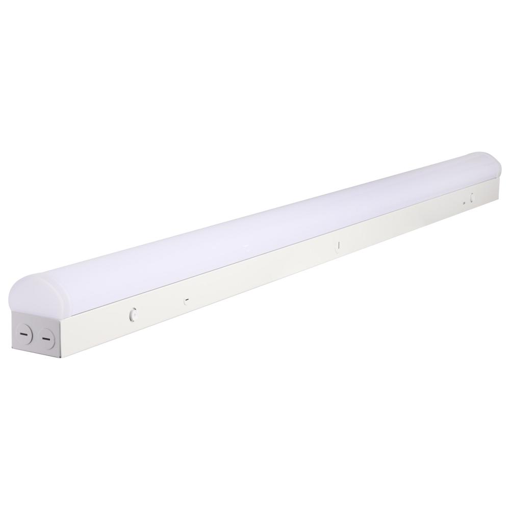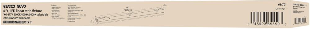 SATCO NUVO's 65-701 4-foot LED Linear Strip Fixture offers adaptable lighting for diverse applications. This field-selectable fixture provides wattage options of 30W, 40W, or 50W and color temperature settings of 3500K, 4000K, or 5000K. With a universa