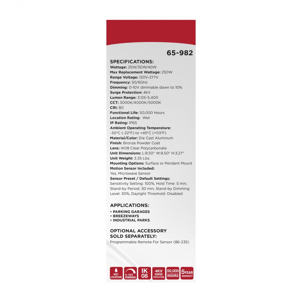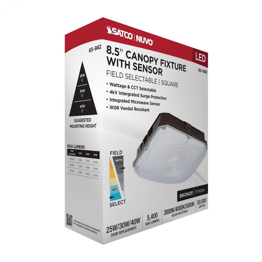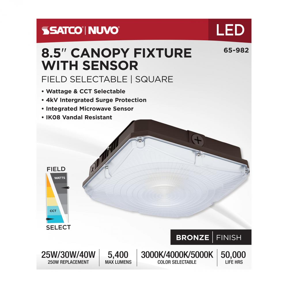 8.5 Inch LED Field Selectable Canopy Fixture With Sensor; 25/30/40 Watts; 3K/4K/5K CCT; 120-277 Range Voltage