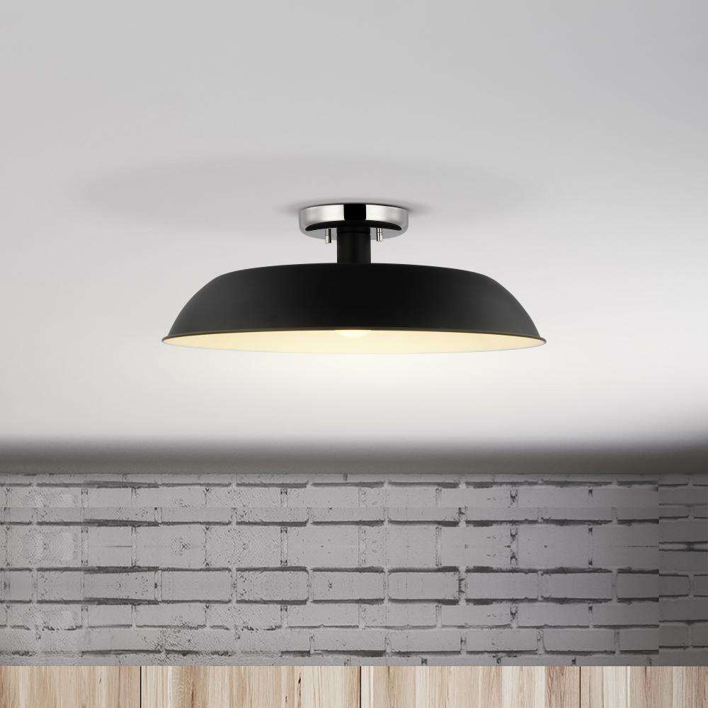 Designed with neutral, clean lines, the Colony medium semi-flush is ideal for an eat-in kitchen, entryway, hallway and even a bedroom. The loft-style shallow pan metal shade is done in matte black, with a white interior to reflect the downfacing lamp. The