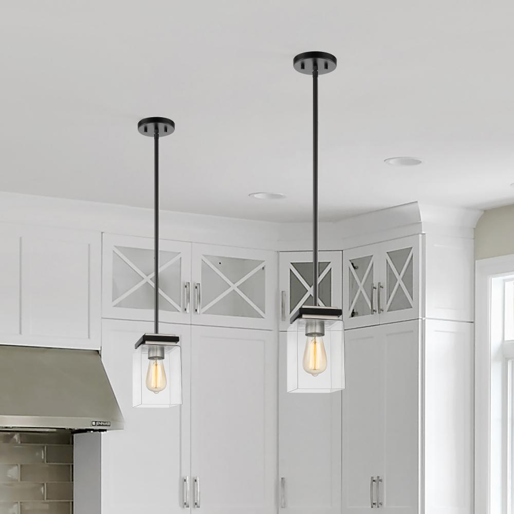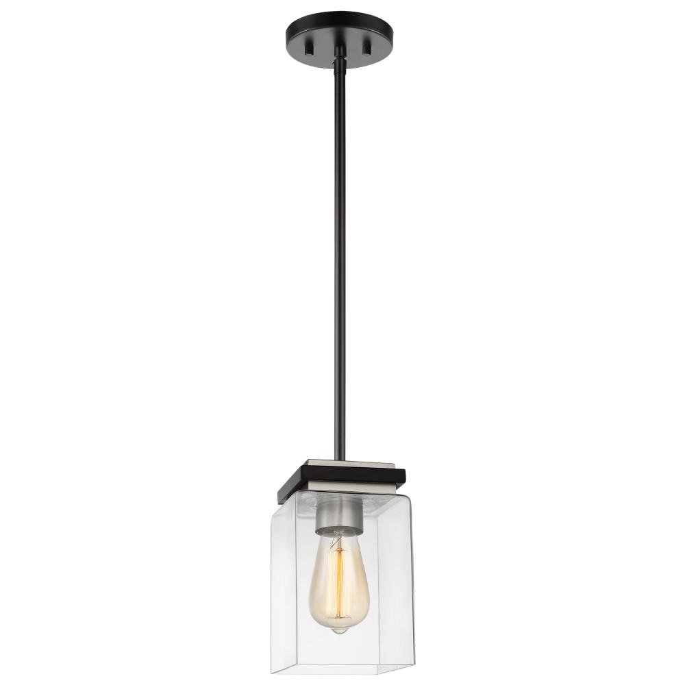 A combination of glass and metal comes together to create the stunning design of the Crossroad mini pendant. The square, clear glass shades showcase the bulbs. The socket and base are finished in brushed nickel to contrast beautifully with the matte black