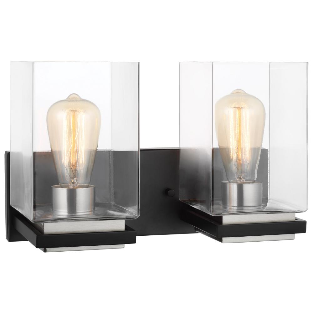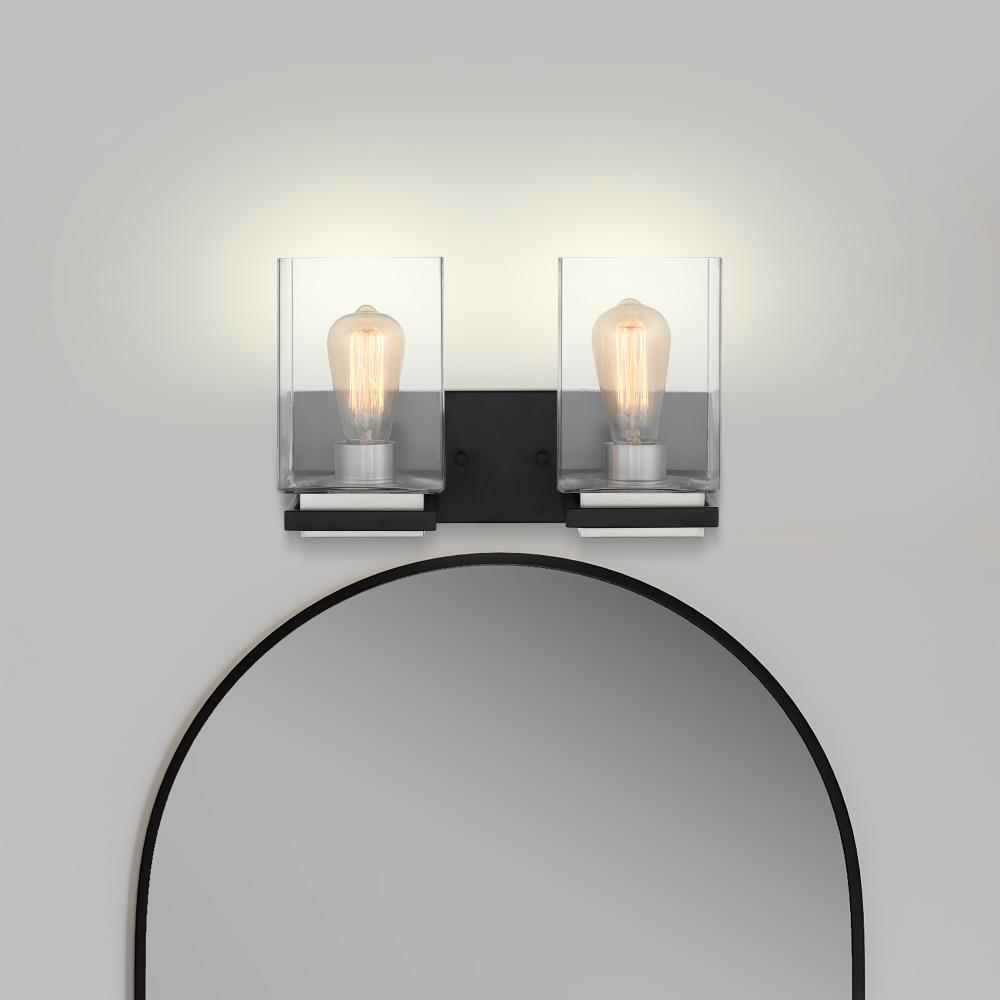 A combination of glass and metal comes together to create the stunning design of the Crossroad vanity light. The square, clear glass shades showcase the bulbs. The sockets and base are finished in brushed nickel to contrast beautifully with the matte black