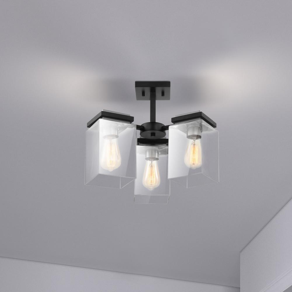 A combination of glass and metal comes together to create the stunning design of the Crossroad semi-flush mount. The square, clear glass showcases the bulbs. The sockets and base are finished in brushed nickel to contrast beautifully with the matte black f