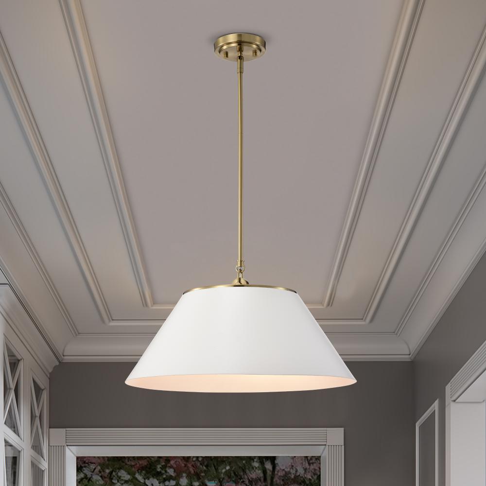 With subtle detailing, the Dover large pendant is graceful yet unassuming. The simple white shade features a white lining to reflect the light, and the trim is finished in vintage brass to match the fixture's body. Place a trio of them over the kitchen