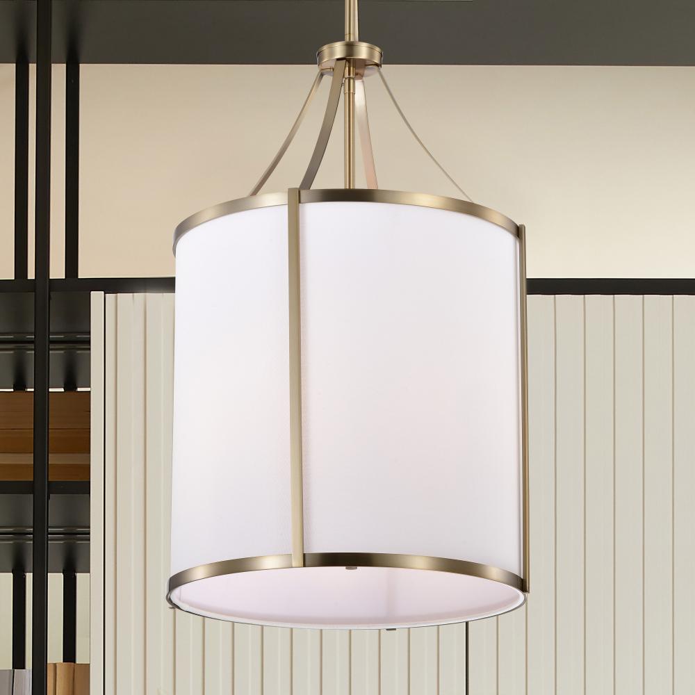 Classic design is perfectly showcased with the Easton 60-7962 large pendant, bringing traditional design, and refined details, to name a few of the characteristics of this beautiful series. A white linen cylinder-style shade softly diffuses illumination fo