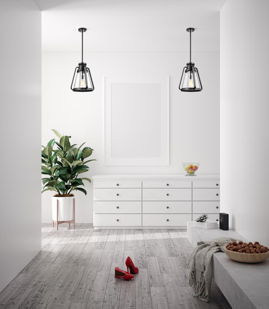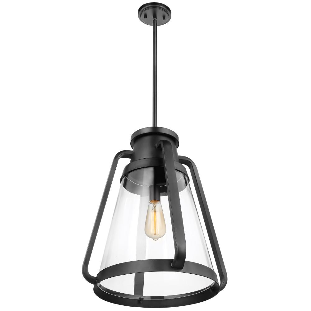 Glass and overlaying metal create a nice depth with the Everett 60-7554 large pendant. The clear, tapered glass provides 360-degree illuminations. When paired with a vintage bulb, it creates a maritime-vintage style. A matte black finish on the fixture bod