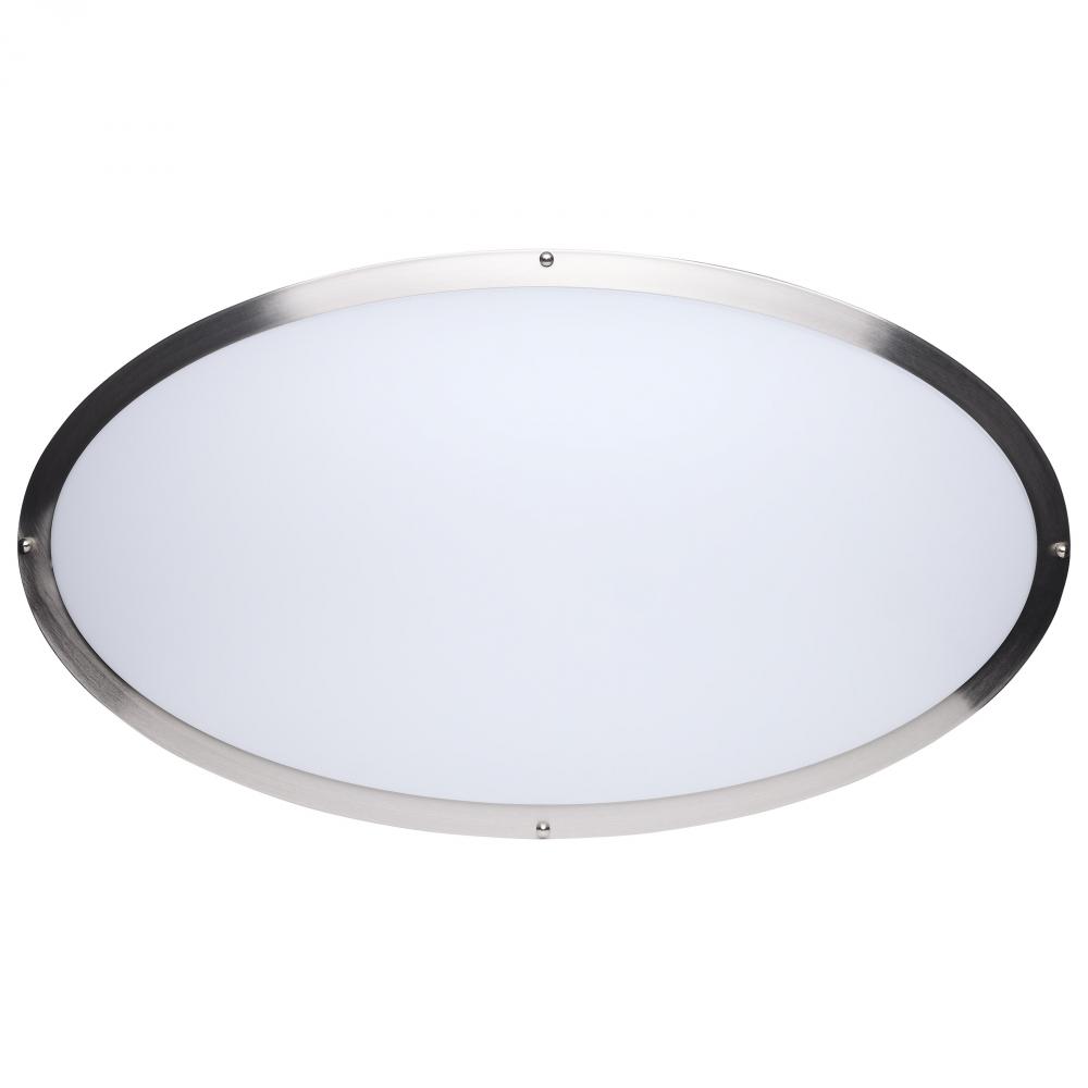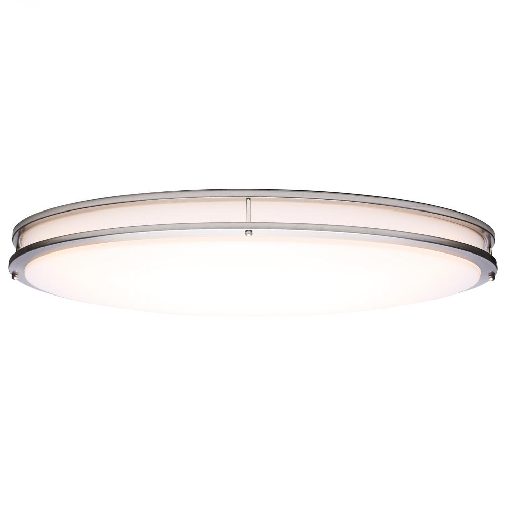 The SATCO NUVO 62-1881 Glamour 32-inch Oval Flush Mount in Brushed Nickel combines modern design with energy-efficient performance, featuring 5 CCT selectable technology (2700K–5000K) and 90 CRI illumination for superior color rendering. This 50-watt fix