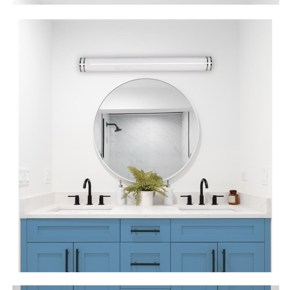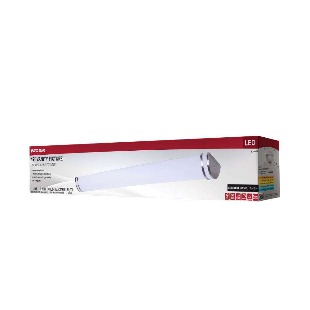 The SATCO NUVO 62-1872 Glamour 49-inch Vanity Fixture in Brushed Nickel combines sleek design with 5 CCT selectable technology (2700K–5000K) and 90 CRI illumination for superior color rendering. This 50-watt fixture replaces 300W incandescent lighting, o