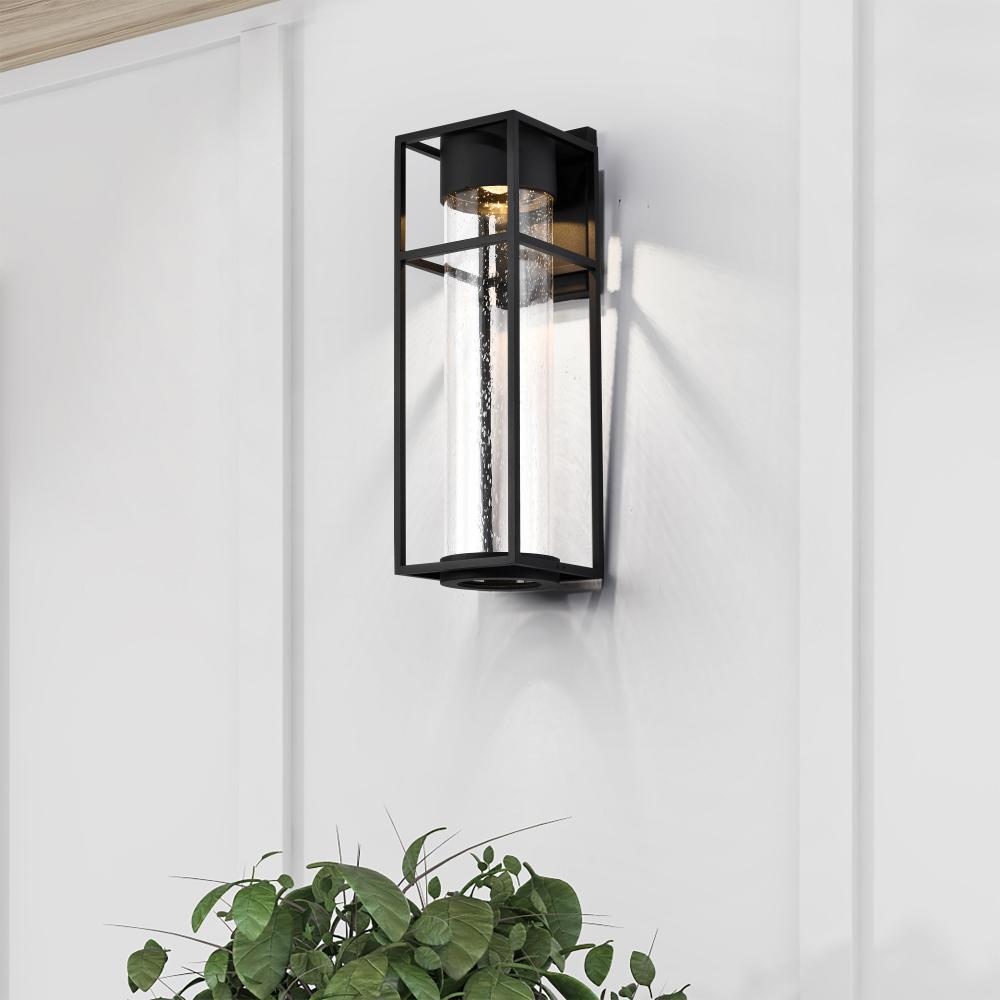 The Ledges LED large outdoor wall lantern blends a simplistic design with great style. The rectangular framework of the fixture is finished in matte black and highlights the cylindrical clear seeded glass housing the integrated LED module. Perfect for mode