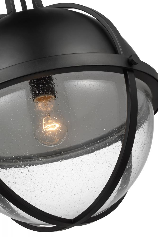 The striking Lincoln 60-7675 large pendant was inspired by an armillary sphere, consisting of a framework of elegant rings. Broad, circular bands surround the orb, and knob details in a matte black finish enhance the clear seeded glass for a prominent, sty