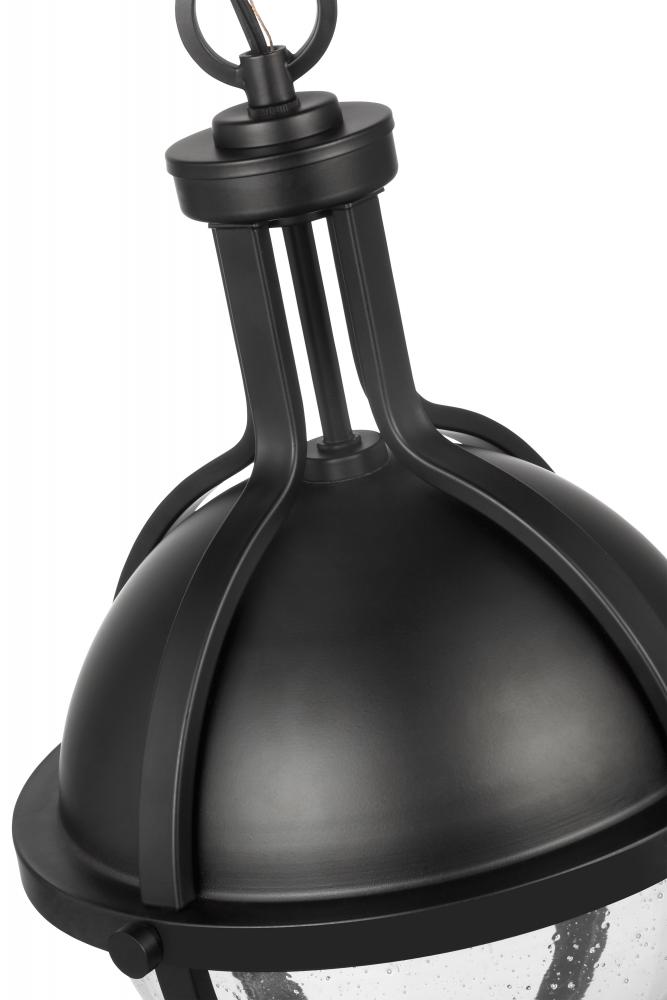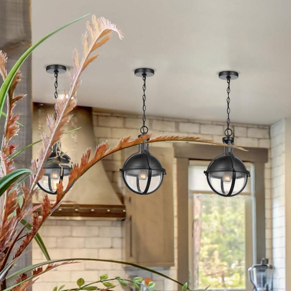 The striking Lincoln 60-7674 medium pendant was inspired by an armillary sphere, consisting of a framework of elegant rings. Broad, circular bands surround the orb, and knob details in a matte black finish enhance the clear seeded glass for a prominent, st