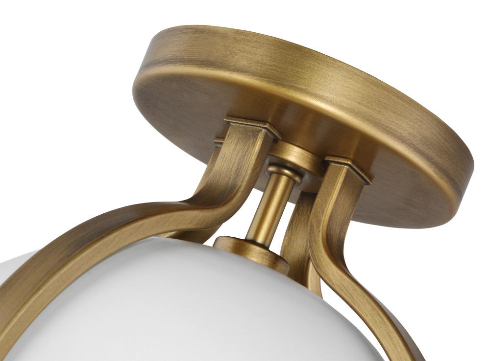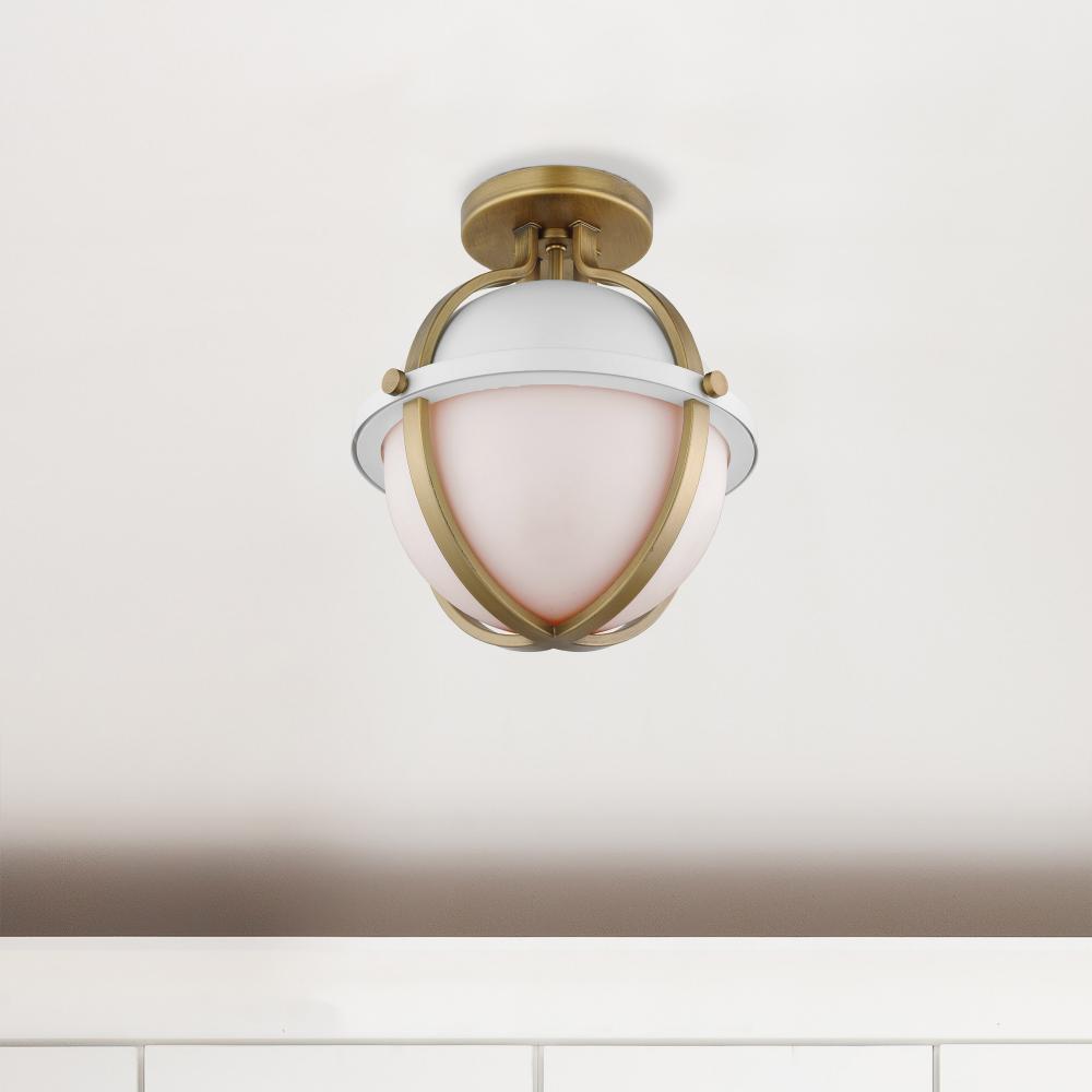 The striking Lincoln 60-7663 semi-flush mount was inspired by an armillary sphere, consisting of a framework of elegant rings. Broad, circular bands surround the orb, and knob details in a brass hue enhance the opal glass and matte white finish for a promi