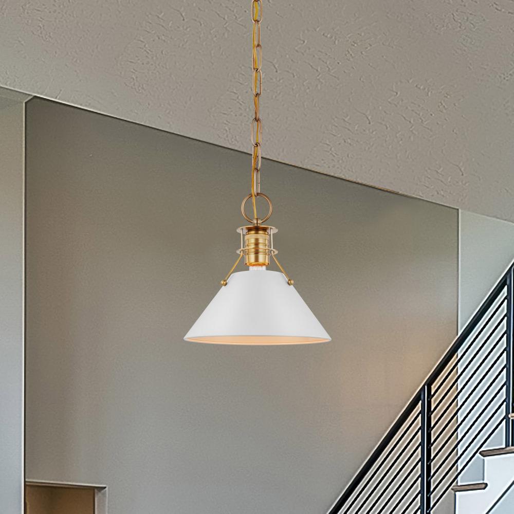 Open, airy and full of charm, the Outpost 60-7522 small pendant features a unique style all its own. The cone shade is suspended with slim rods, showcasing the exposed decorative burnished brass socket and a slight peek of the vintage bulb. The matte white