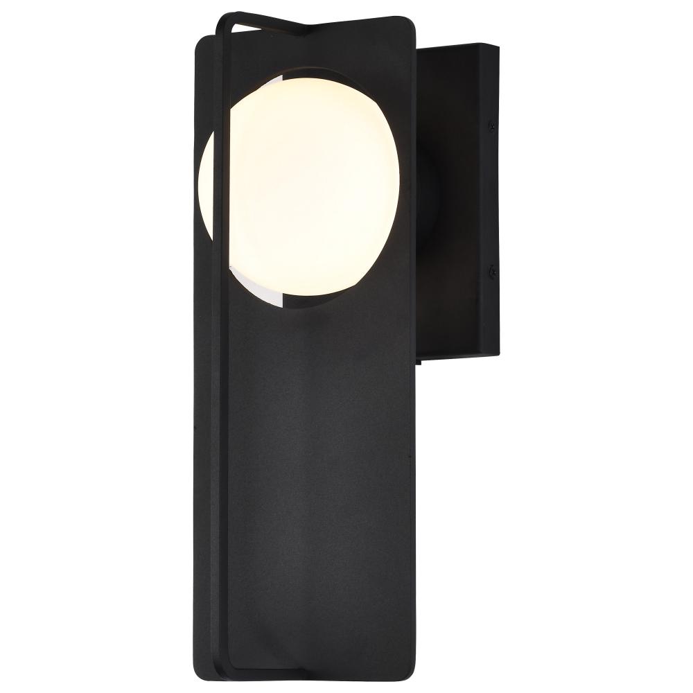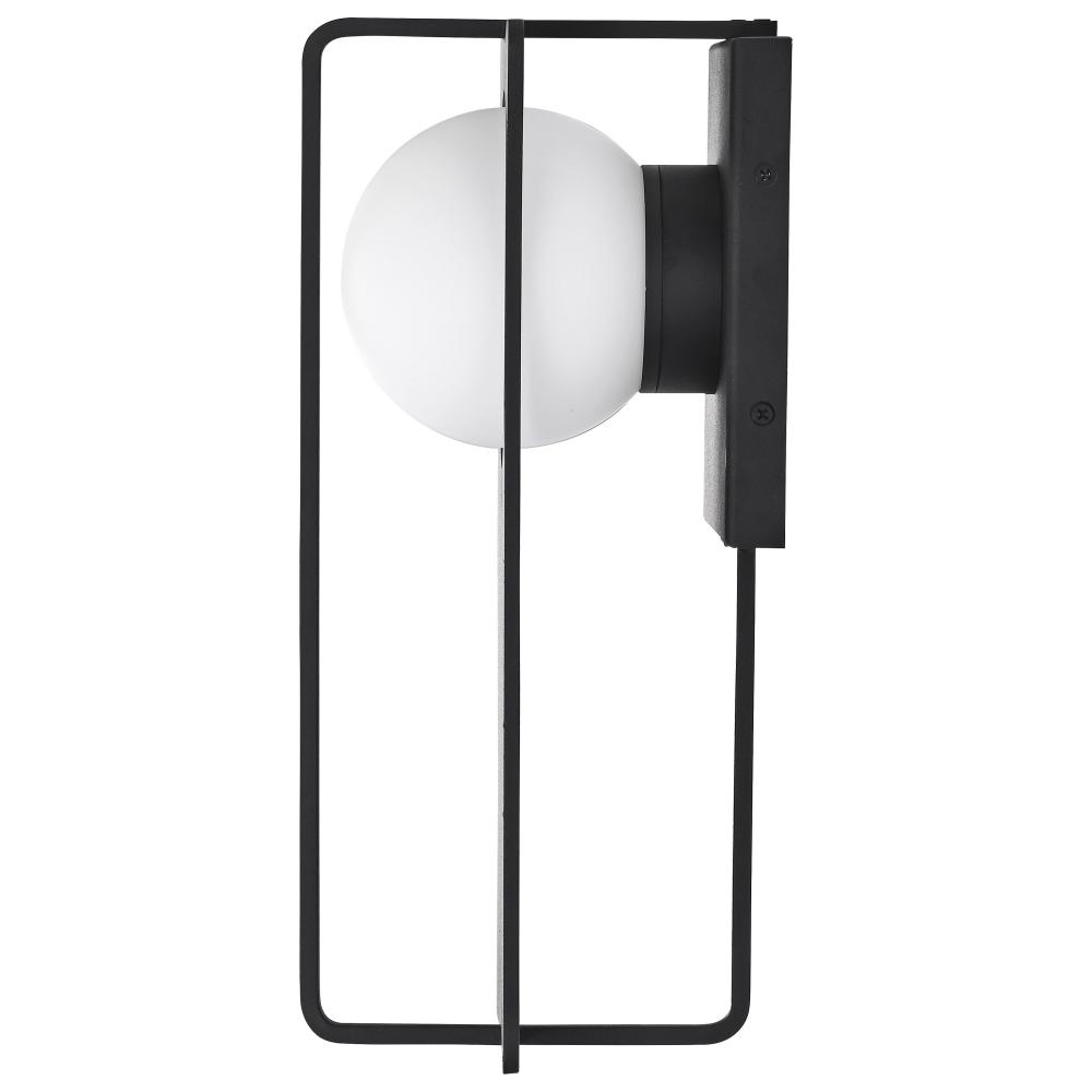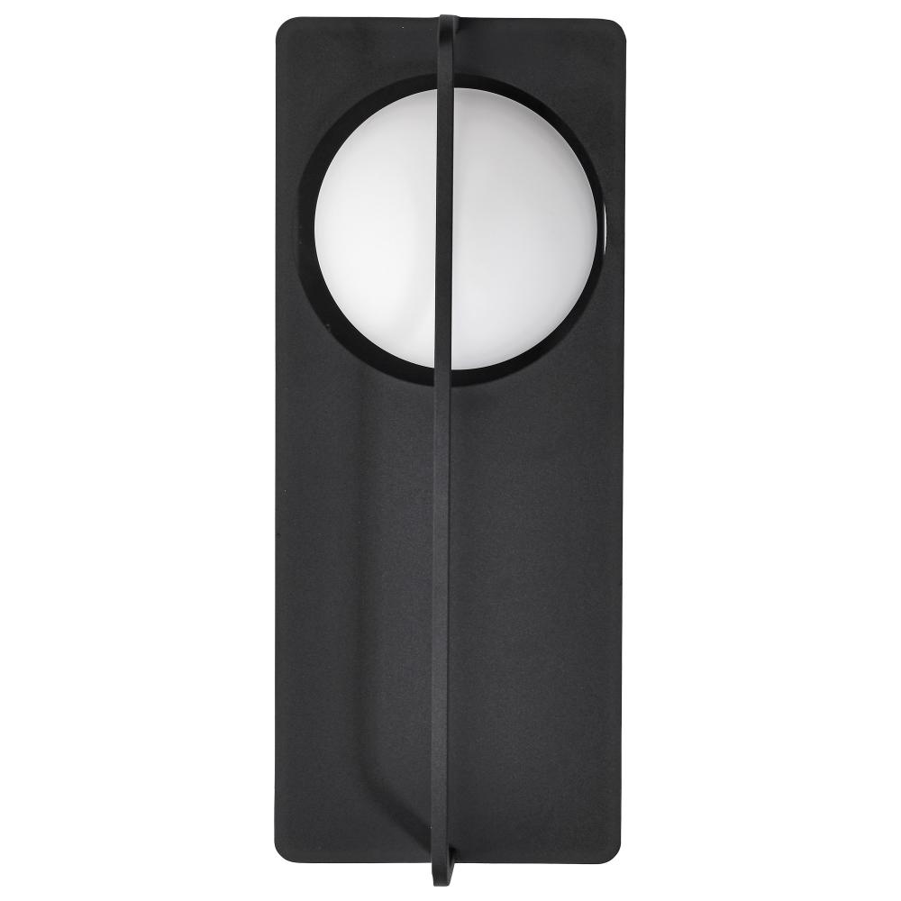 The Portal 62-1609 medium outdoor wall lantern features LED technology and a contemporary, modern design. A single bar spans the length of the fixture with a broad, rectangular plate as the backdrop. A single glass orb appears to float within the fixture a