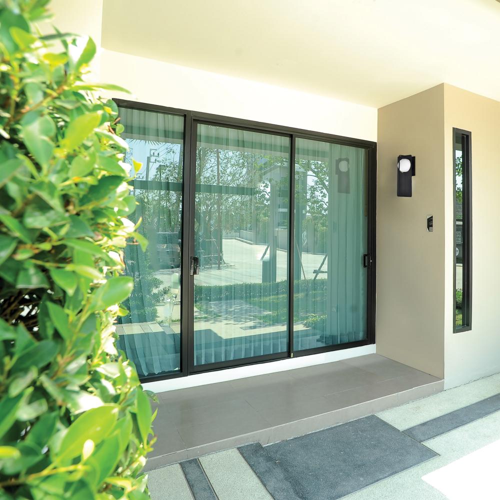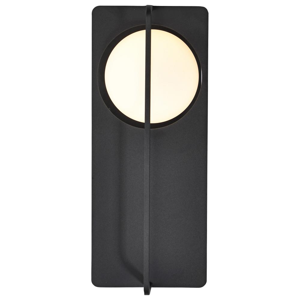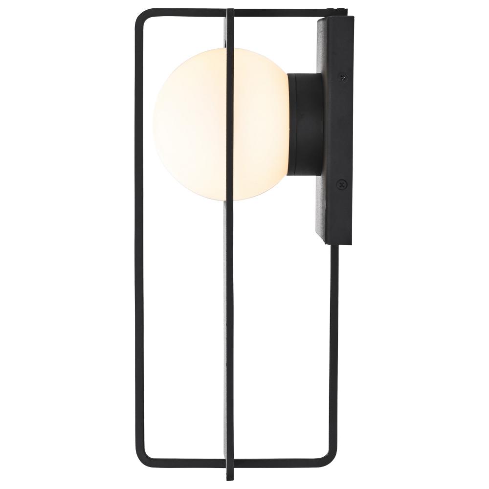The Portal medium outdoor wall lantern features LED technology and a contemporary, modern design. A single bar spans the length of the fixture with a broad, rectangular plate as the backdrop. A single glass orb appears to float within the fixture and provi