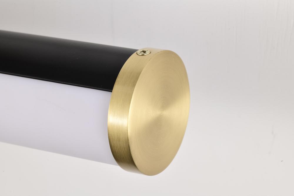 The design of the Solano integrated LED bathroom vanity lights series is sleek and minimalist, with a simple yet elegant shape. The stylish fixture is finished in black with brushed brass accents accentuate the clean lines and broad backplate. A white acry