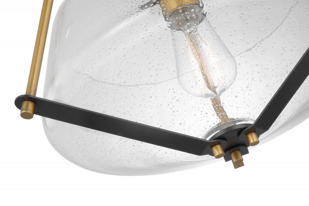 Mid-century charm in a stunning silhouette graces the Starlight Collection. This design is offered in matte black with a pop of brass on the fixture arms and socket covers, adding interest. The antique-inspired seeded clear glass continues the timeless sty