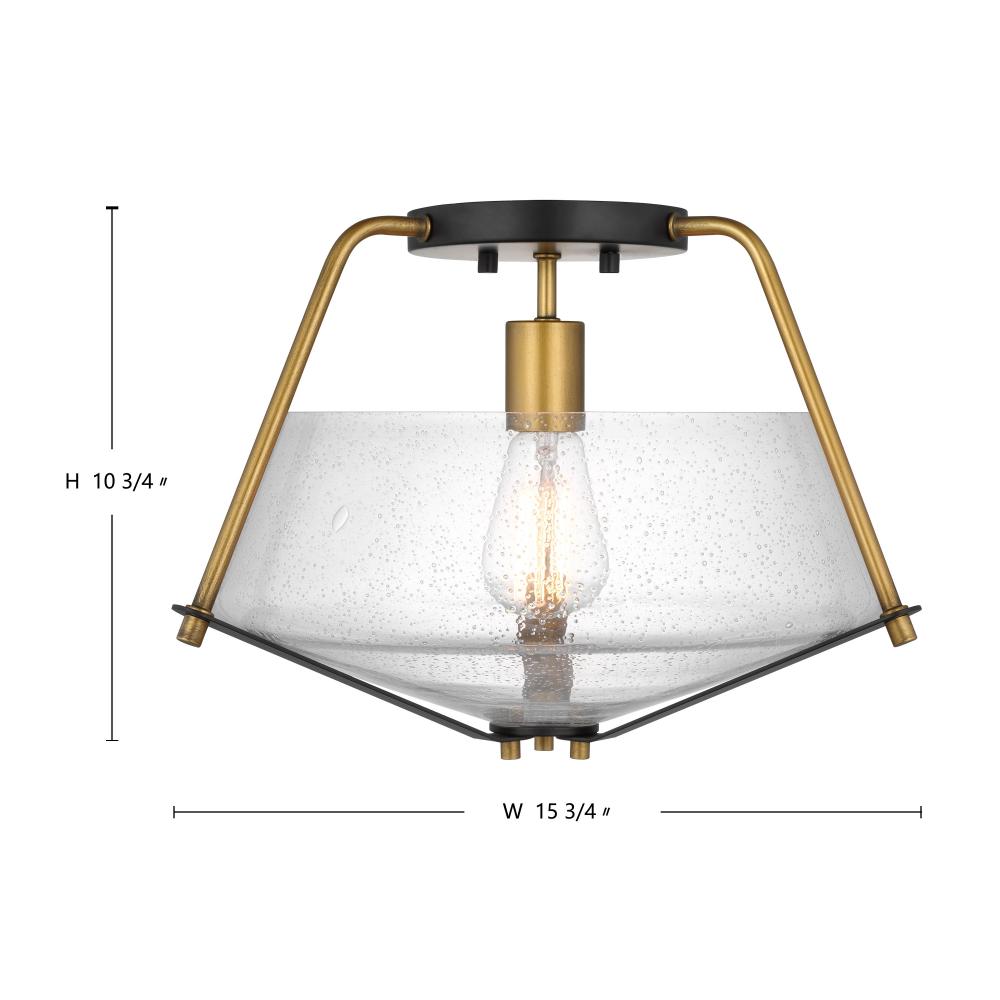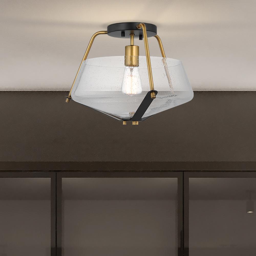 Mid-century charm in a stunning silhouette graces the Starlight 60-7683 one light semi-flush mount. This design is offered in matte black with a pop of brass, adding interest. The antique -inspired seeded clear glass continues the timeless style throughout