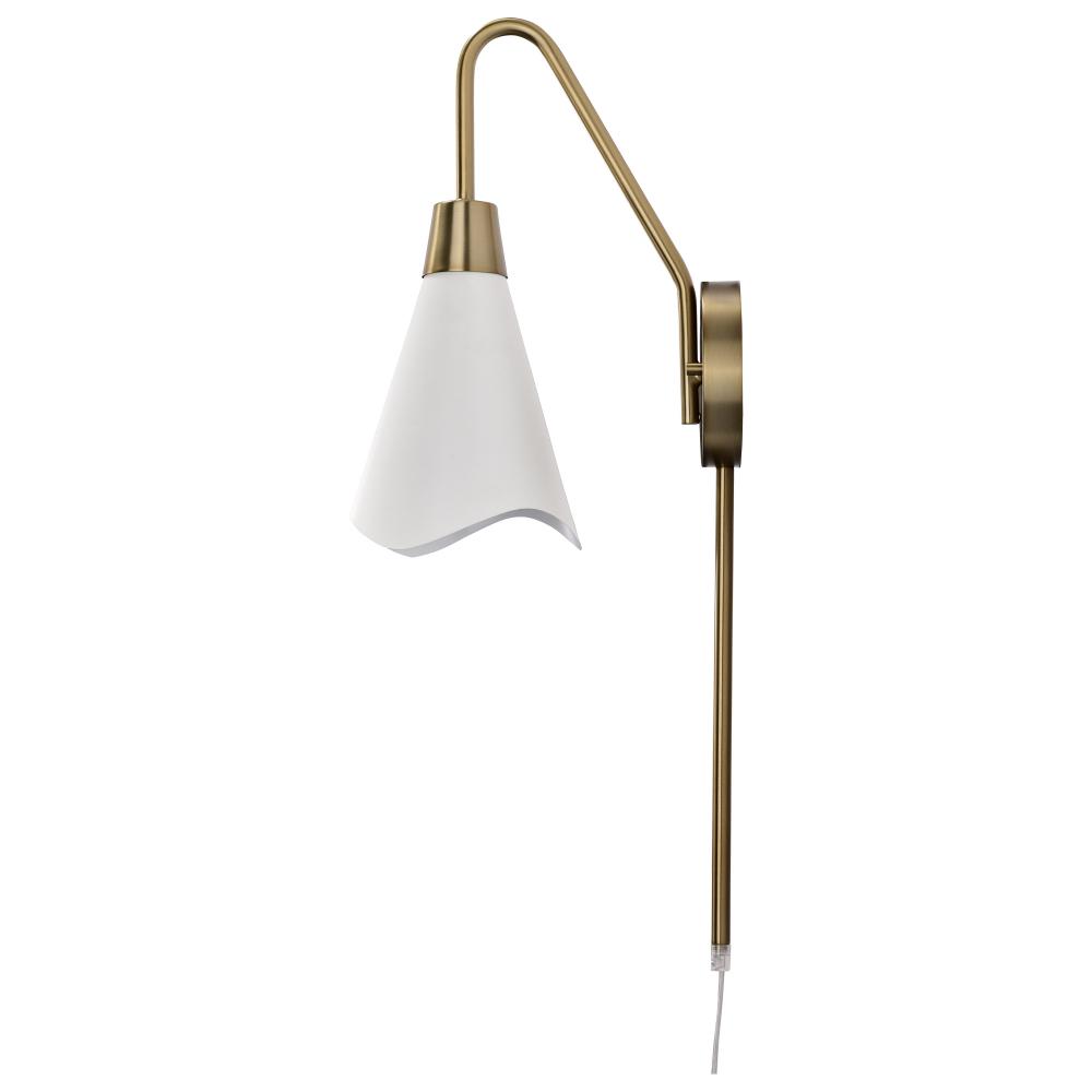 The Tango 60-7468 wall light proves that simple style does not have to be boring. It features burnished brass accents on the backplate, cable cover, and fixture arm, which gives the design some pop. The matte white metal shade is laser-cut on its edge in a