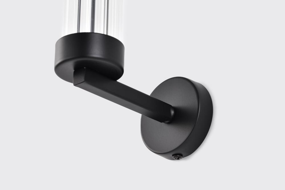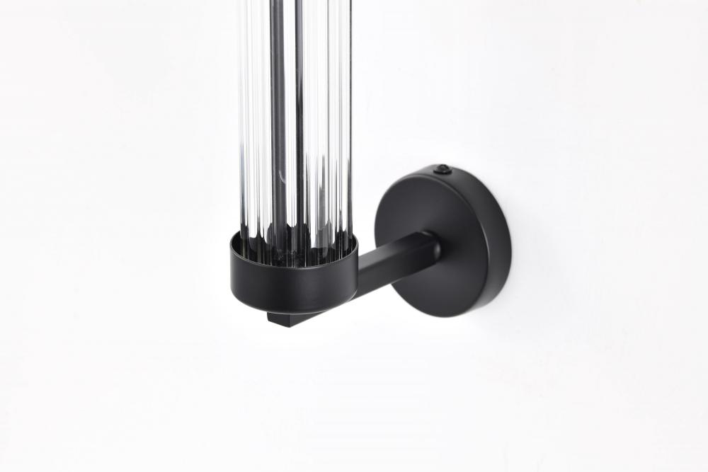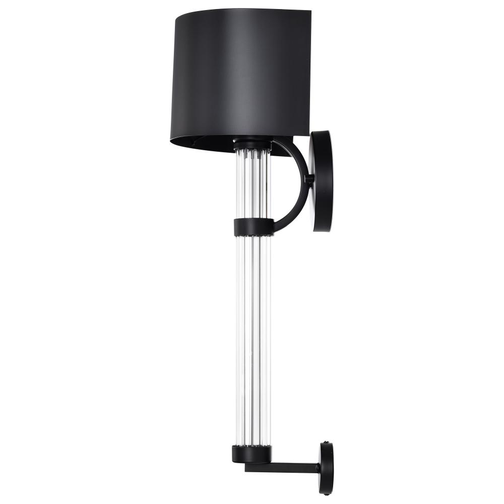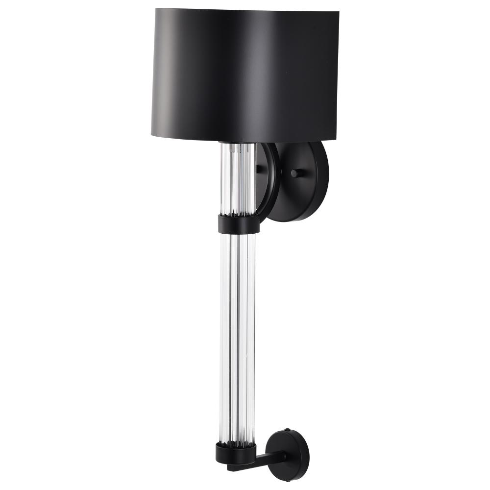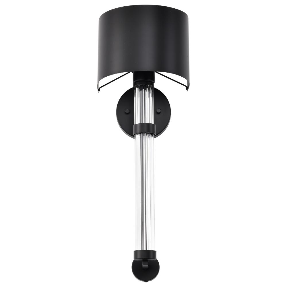 The Teagon 60-7756 wall sconce is a modern lighting fixture that adds a touch of superior style to any room. Featuring a matte black finish on the base and matching metal shade, the sleek and contemporary look is accentuated with a clear glass column encom