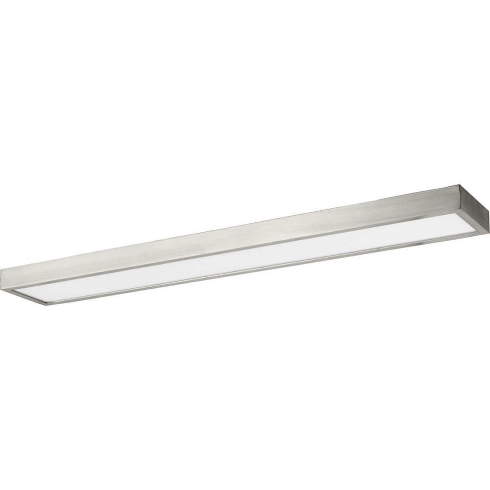 Incorporate a versatile lighting solution with the 1-Light Brushed Nickel 32-Inch Frosted Glass LED Modern Bath Vanity Light. The thin rectangular frame is coated in a subtle brushed nickel finish for a clean aesthetic. Light diffuses through a light guide covered by a frosted polycarbonate diffuser shade that provides even illumination without dark spots, shadows, or glare.
