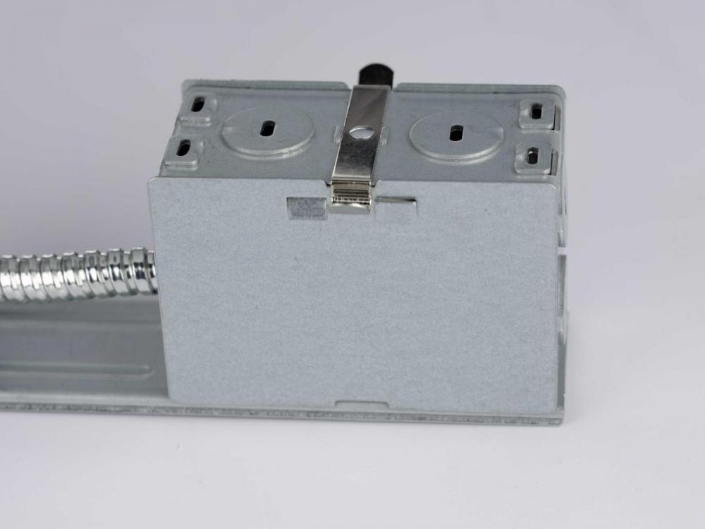 Universal J-box with snap-out sides;Removable housing for field inspection of wiring;Ceiling opening measures 5-5/8 in;Recessed depth measures 5-1/2 in;Pryouts ½ in and ¾ in