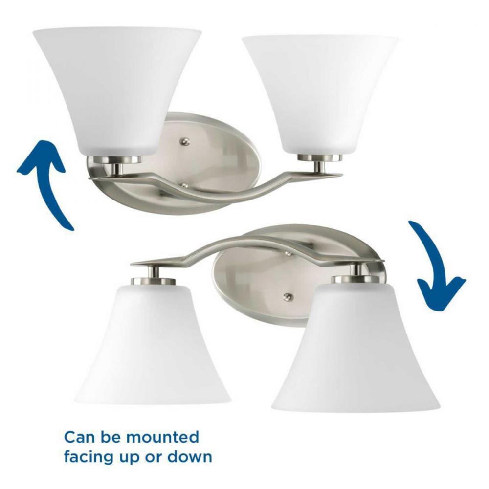 Ideal for a bathroom and powder room.;Perfect for modern and transitional style settings;Beautiful brushed nickel finish;Elegant etched glass shades;Mount the light fixture facing up or down;Use 2 medium base bulbs that are sold separately (100 W max - LED