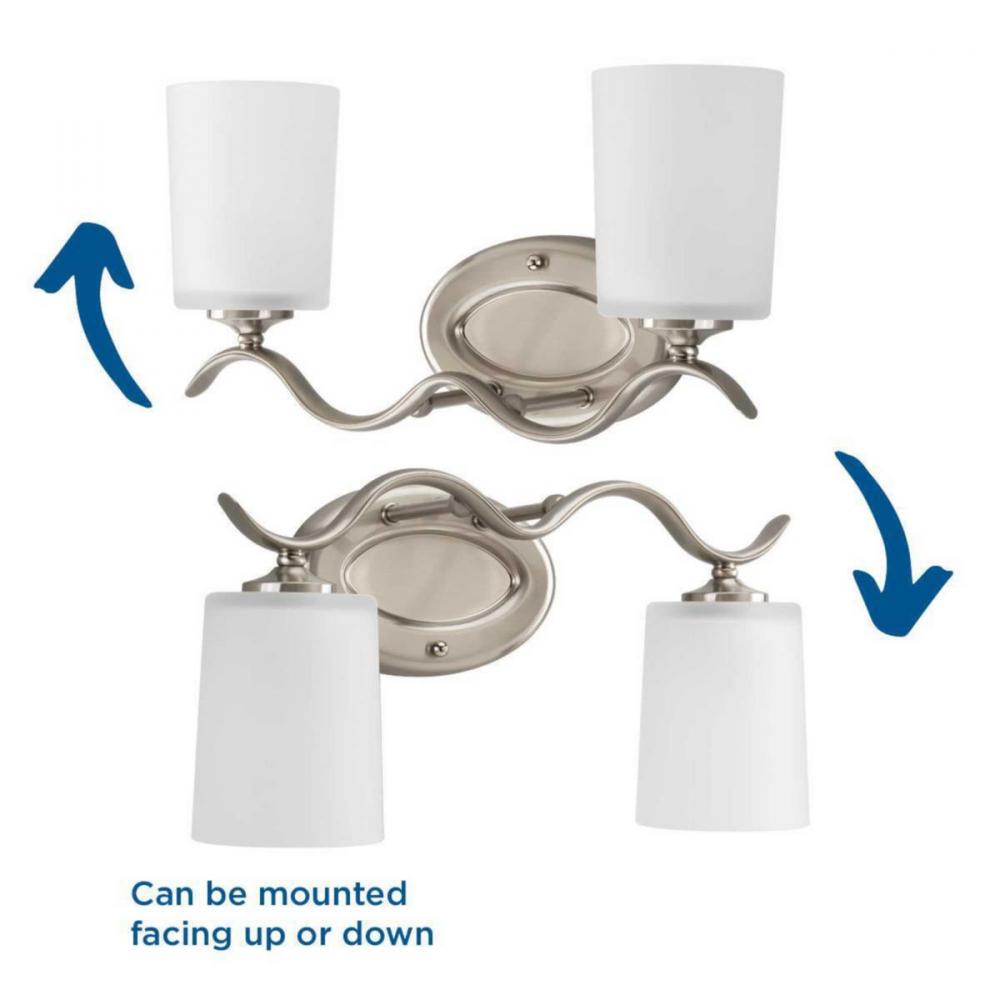 Ideal for a bathroom and powder room.;Perfect for traditional and transitional style settings;Beautiful brushed nickel finish;Elegant etched glass shades;Mount the light fixture facing up or down;Use 2 medium base bulbs that are sold separately (100 W max