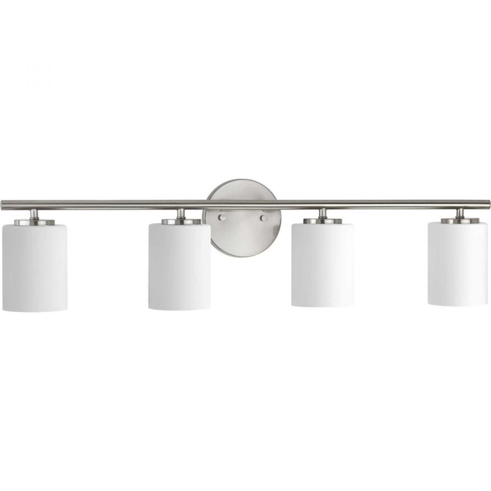 Ideal for a bathroom;Perfect for modern and transitional style settings;Beautiful brushed nickel finish;Elegant etched painted white glass shades;Mount the light fixture facing up or down;Use 4 medium base bulbs that are sold separately (100 W max - LED/CF