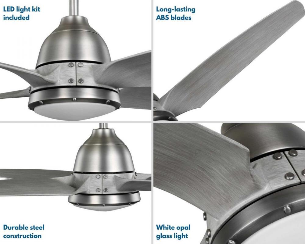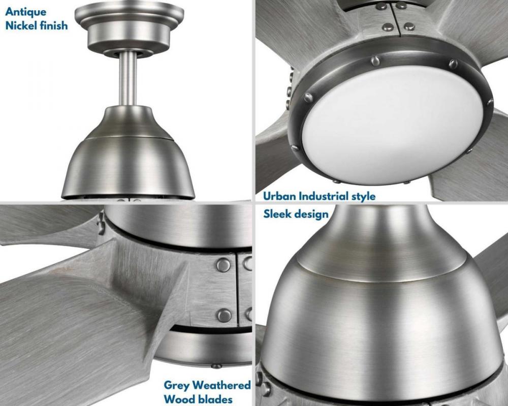 Incorporate nostalgic character reminiscent of aviation days gone by with the Alleron Collection 4-Blade Grey Weathered Wood 56-Inch DC Motor LED Urban Industrial Ceiling Fan. The sleek metal ceiling canopy is coated in a silver antique nickel finish and complemented by hand-finished grey weathered wood blades modeled after vintage airplane propeller blades. The blades are crafted from a strong, all-weather ABS material to prevent warping. A full-function 6-speed remote control with batteries is included so you can adjust full-range dimming and fan speed without breaking a sweat. For ideal illumination, an integrated LED source is included (100w max/2,100 lumens per LPW/120v/90 CRI). Dimmable. The ceiling fan's modern industrial flair is ideal for any living room in urban industrial style settings. It's time to breathe new life into the mundane every day with timeless and truly transformative lighting. Make your purchase today to begin your journey to a whole new lighting experience. Progress Lighting products are designed for exceptional quality, reliability, and functionality.