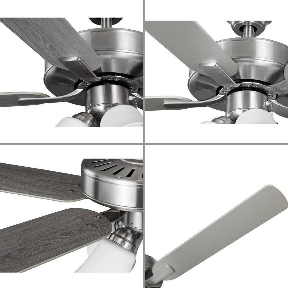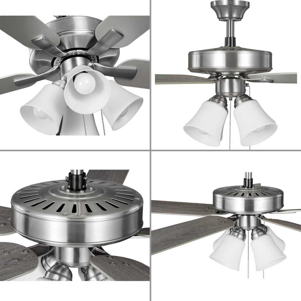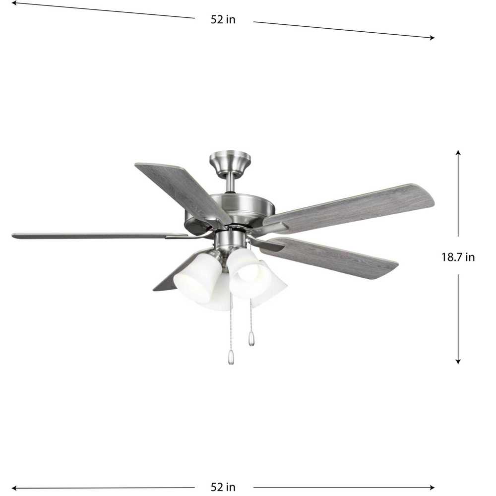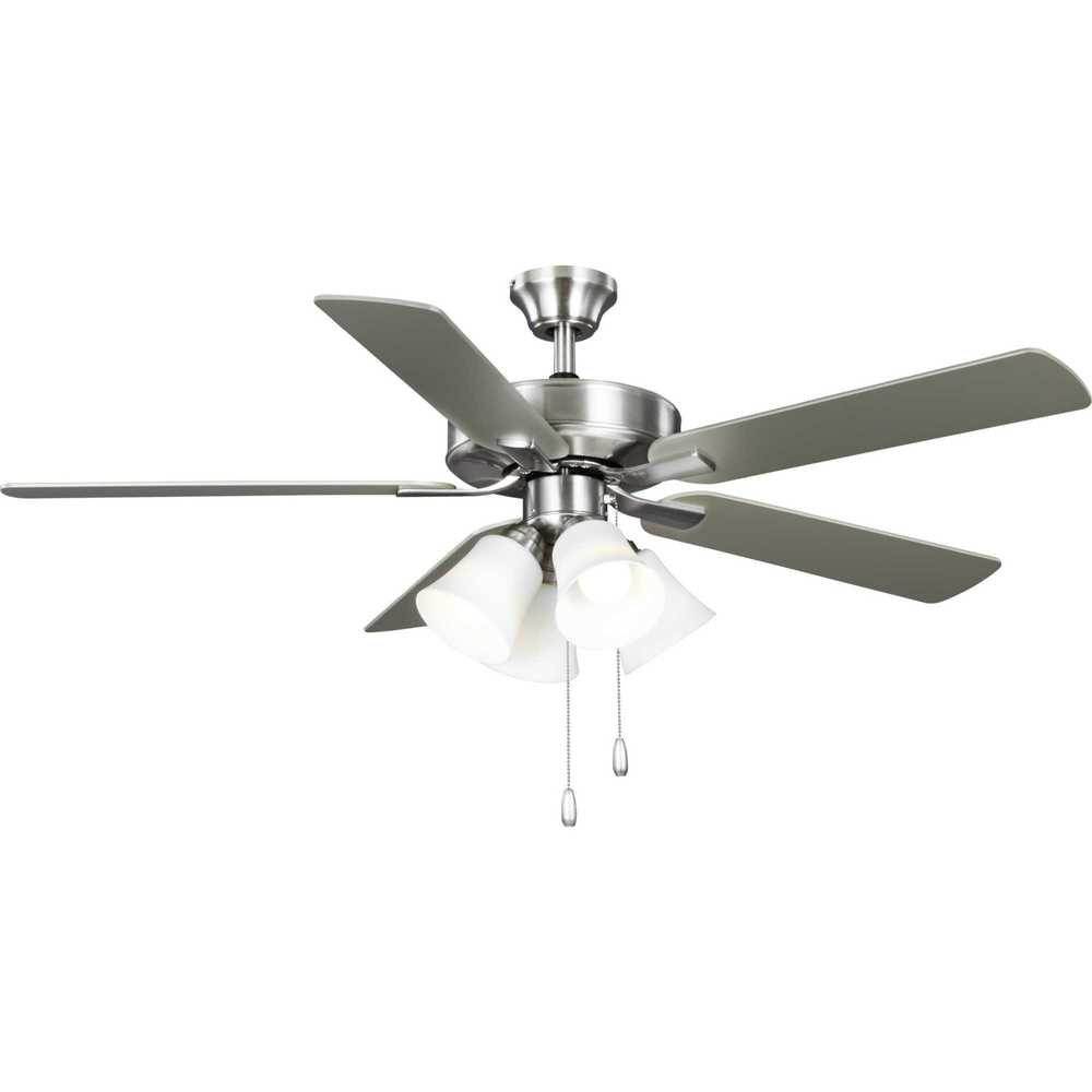 The AirPro 52” 5-blade ceiling fan refreshes interiors with a sleek, modern form coated in smooth Brushed Nickel finish. Five clean-lined fan blades extend outward from a streamlined motor housing that contains a powerful AC motor. Its versatile yet timeless design makes it ideal for a wide range of interior décor styles. The fan has an AC motor for maximum efficiency. Four shatterproof light shade in Etched White offers durability and optimal, even illumination. Four dimmable medium based LED lamps (9W, 90CRI, 3000K) are included. An accessory wall and remote control can be added (sold separately). The fan can be installed on a flat or sloped ceiling. The blade arms have Captive Screws allowing for easier installation.