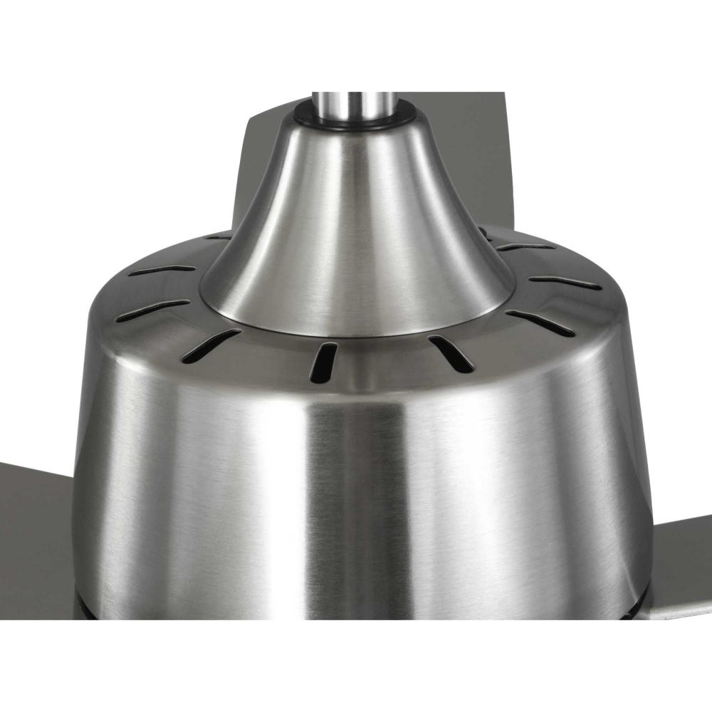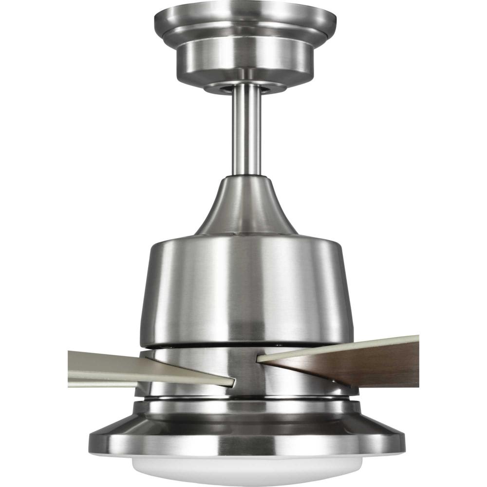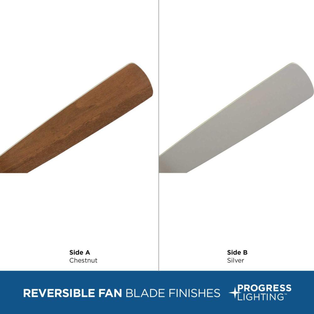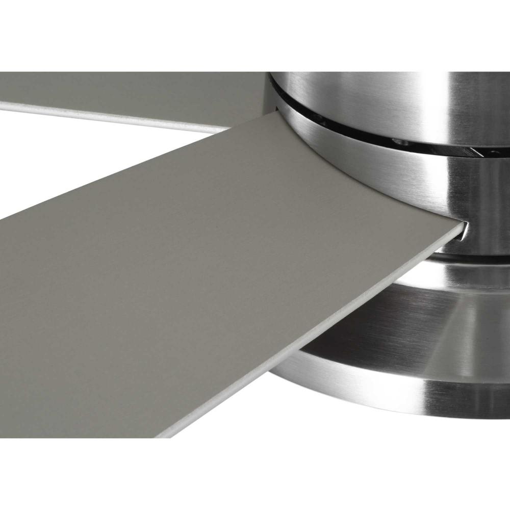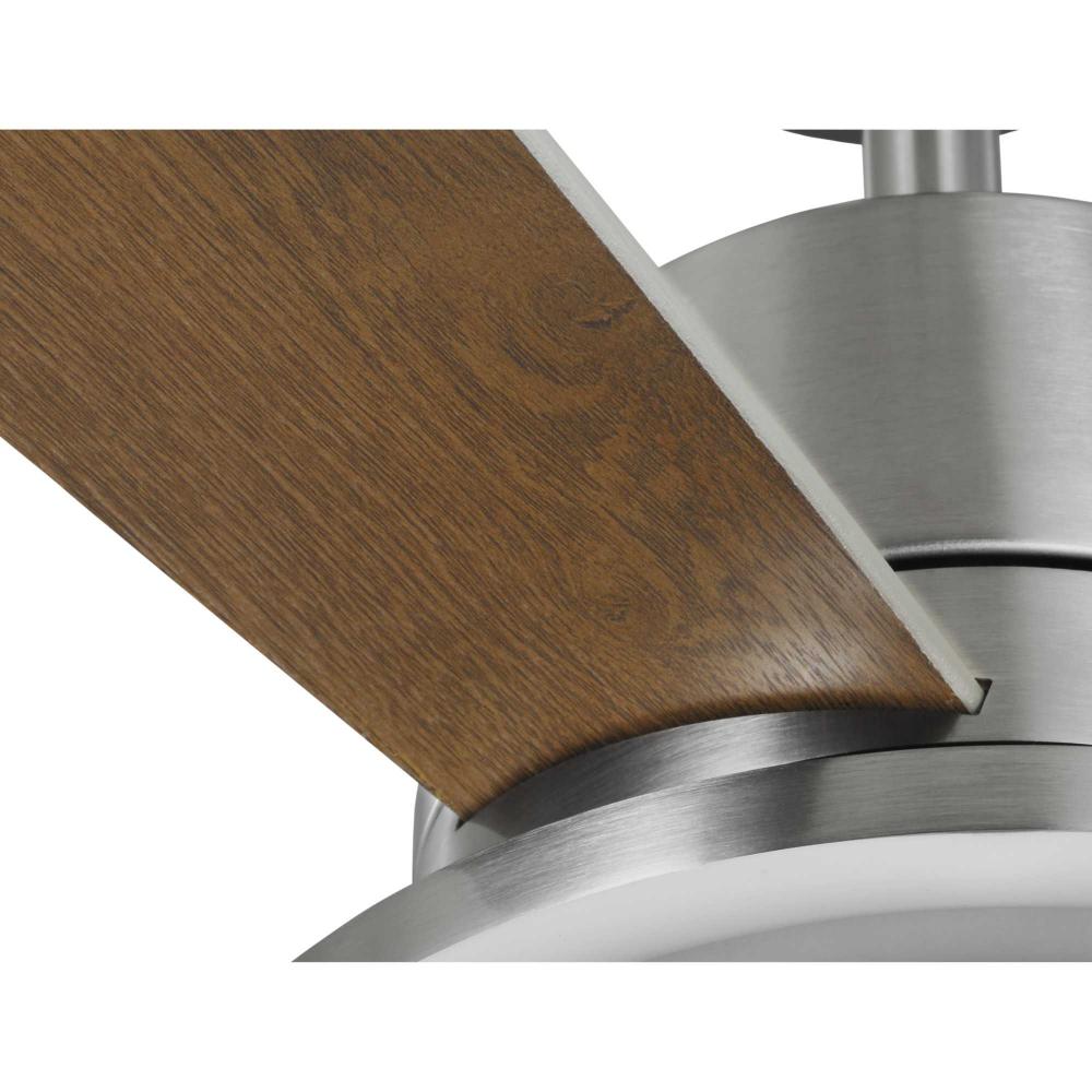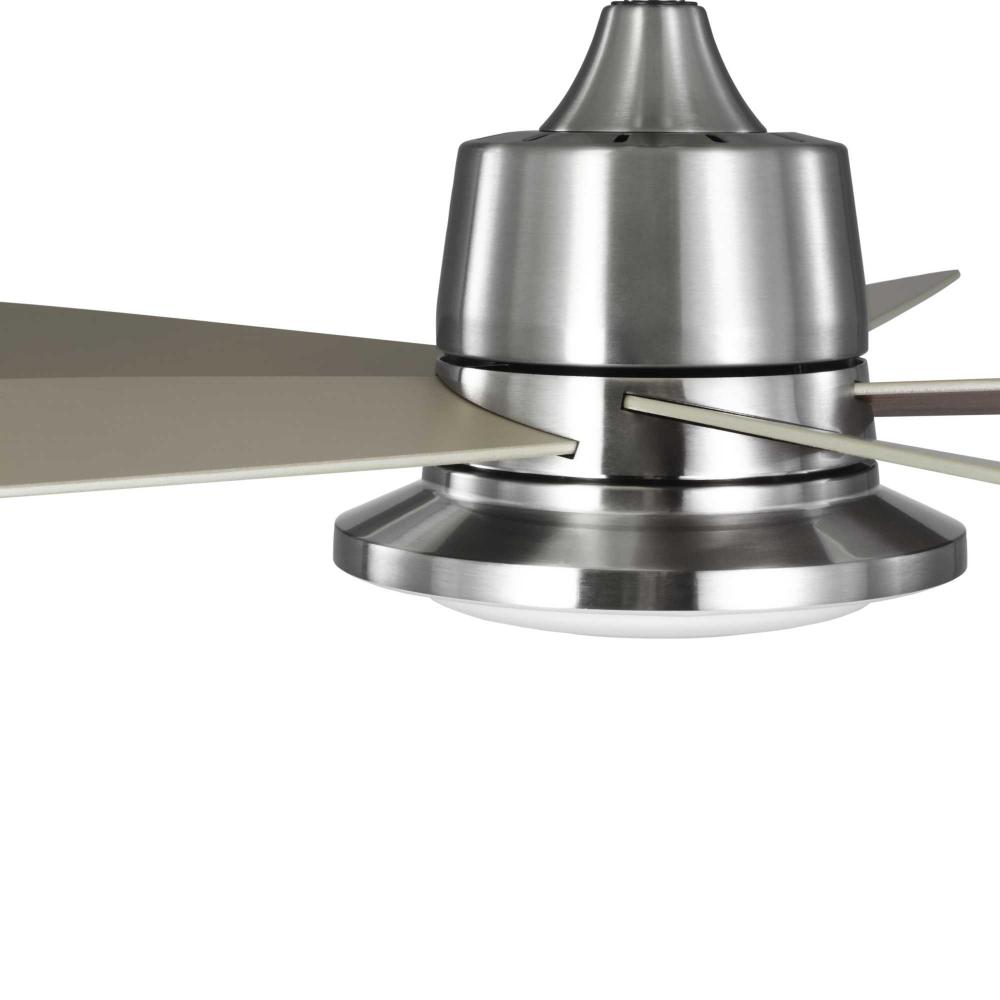 The fan is coated in a subtle brushed nickel with reversible blades of silver and chestnut, accenting the light's contemporary design