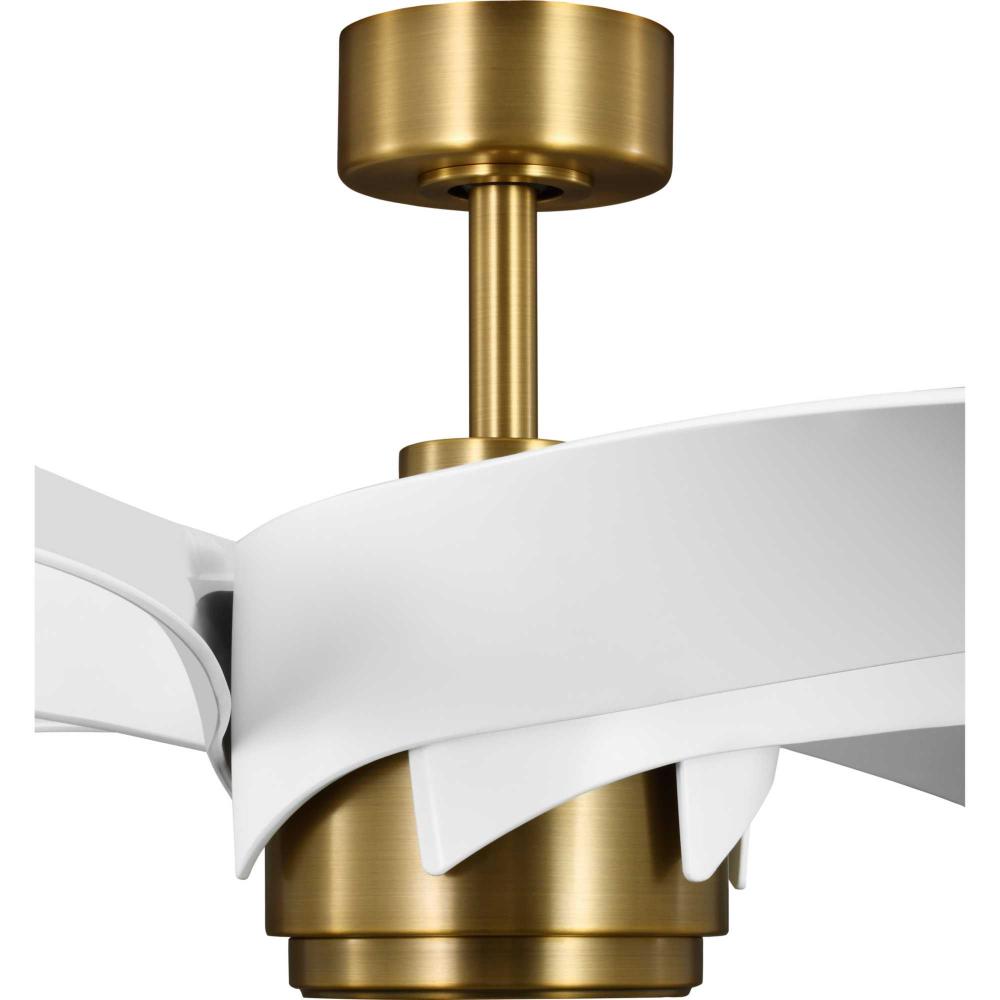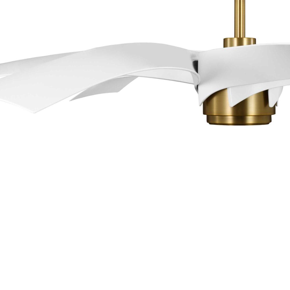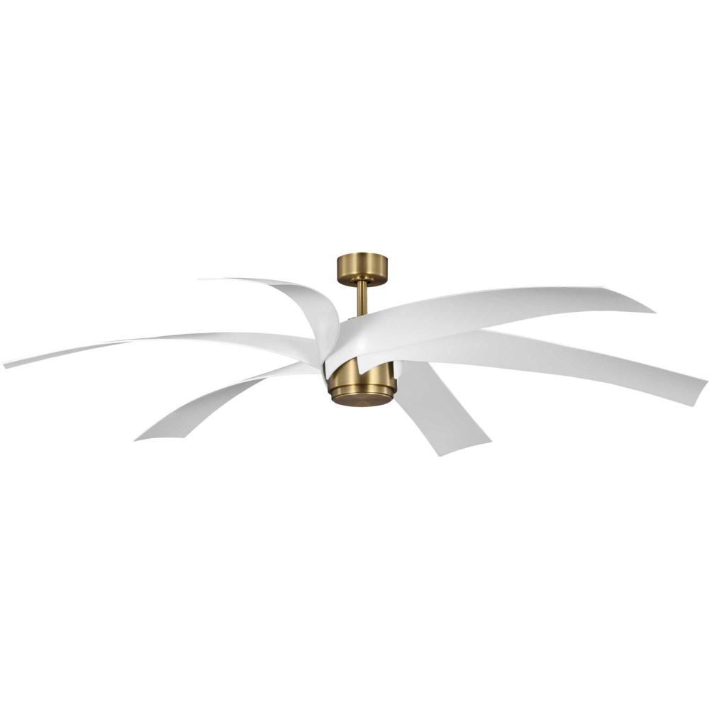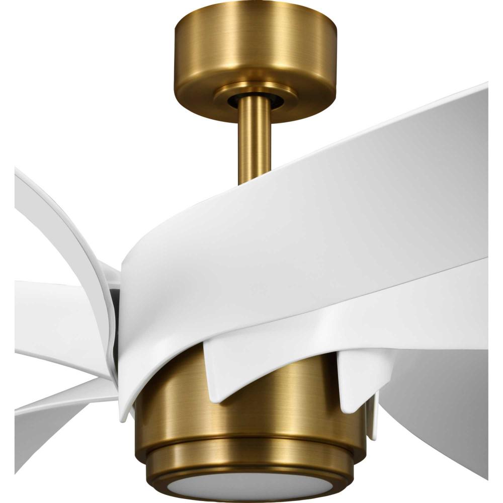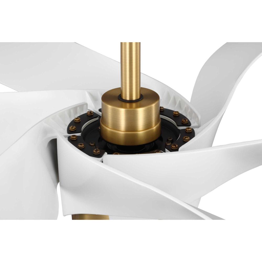 Enhance your indoor living space with the 72-inch, 6-Blade Insigna LED Ceiling Fan, a harmonious symphony of design and innovation. Measuring an impressive 72 inches, this ceiling fan is a true statement piece that commands attention. Its unique windmill-style ABS blades attached to a luxe metallic housing offer a fusion of contemporary aesthetics and innovative engineering. Coated in a classic Vintage Brass finish with Matte White Blades, this sleek fan effortlessly creates a breathtaking visual impact. An LED light kit is included and pairs well with the whisper-quiet DC motor that creates cooling breezes. A full-function remote control is included.