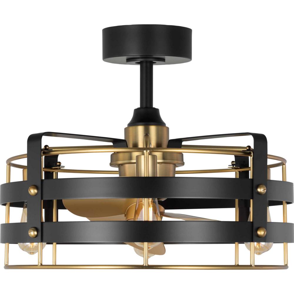 The rustic yet refined aesthetic of the 24-inch Sewell oscillating fandelier brings an urban industrial appeal to the ceiling. A trio of corrosion-resistant polycarbonate blades are enclosed within a striking Matte Black and Brushed Brass cage. Warm illumination is cast from the included decorative clear LED light sources. This fan is part of the new Oscillarâ„¢ Collection of ceiling fandeliers, featuring blades powered by a silent oscillating DC motor with a 360-degree rotation and six speeds, delivering maximum air distribution in every direction throughout a room. Sewell offers dual mounting, making it ideal for flat or sloped ceilings and it can accept a longer down rod. It is damp rated for inside and covered outdoor spaces and includes a full-function remote control and wall bracket.
