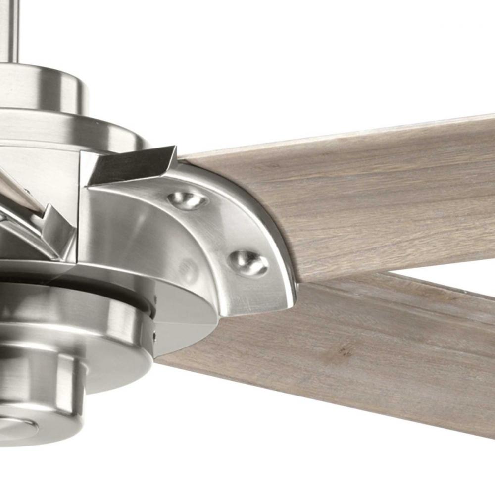 68" Ellwood ceiling fan features a spacious design with five carved wood blades;Ellwood ceiling fan features grey Driftwood blades with a Brushed Nickel finish;A picture of modern design, the functional minimalism of the Ellwood 68" ceiling fan is