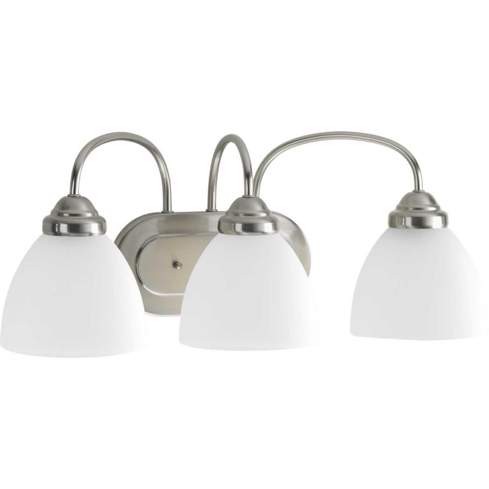 Ideal for a bathroom;Perfect for farmhouse, traditional, and transitional style settings;Beautiful brushed nickel finish;Elegant etched glass shades;Mount the light fixture facing up or down;Use 3 medium base bulbs that are sold separately (100 W max - LED