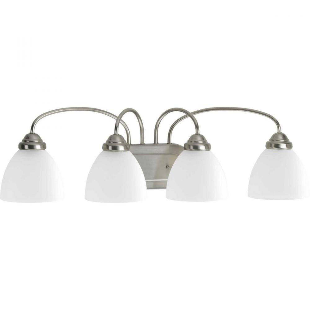 Ideal for a bathroom;Perfect for farmhouse, traditional, and transitional style settings;Beautiful brushed nickel finish;Elegant etched glass shades;Mount the light fixture facing up or down;Use 4 medium base bulbs that are sold separately (100 W max - LED